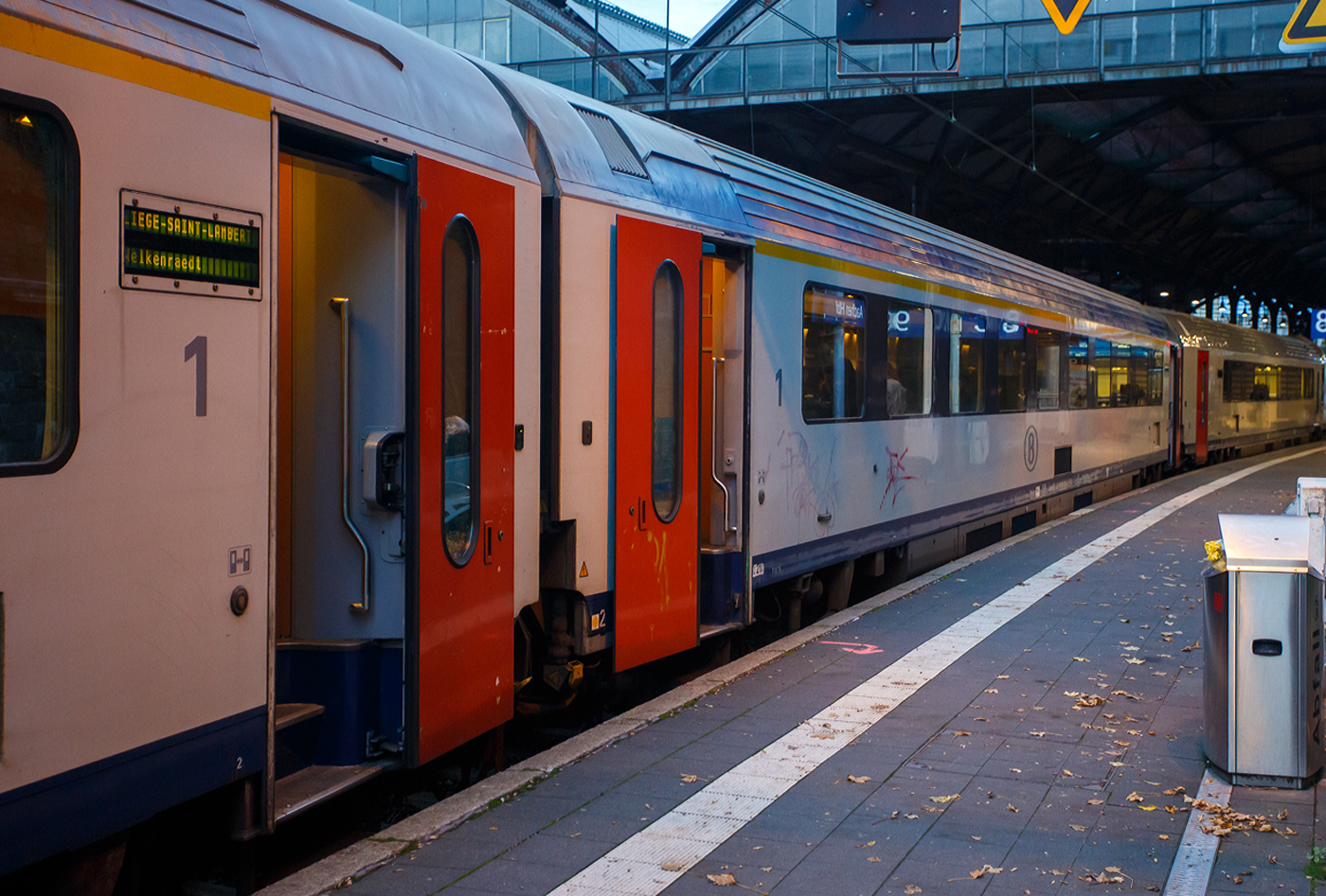 SNCB/NMBS - I11 Reisezugwagen der ersten Klasse, Apm 61 88 10-90 028-1 B-B, ex 11828, eingereiht im Zugverband des euregioAIXpress (S41) von Liège-Saint-Lambert über Welkenraedt nach Aachen (d'Aix-la-Chapelle), am 21 Oktober 2025 im Hauptbahnhof Aachen.