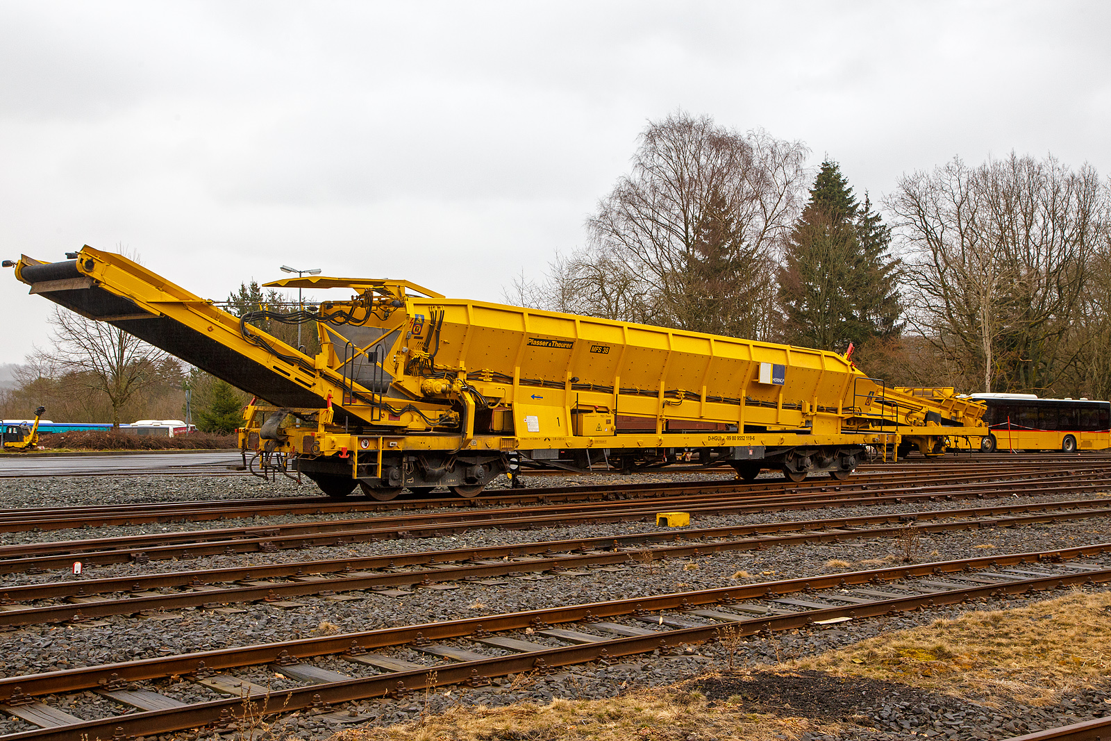 Plasser & Theurer Material-, Förder- und Siloeinheiten MFS 38 (teilweise auch BSW 2000 - Bunker-Schüttgut-Wagen genannt) der HERING Bahnbau, Burbach, Nr. 4, Schweres Nebenfahrzeug Nr. D-HGUI 99 80 9552 122-0, ex 97 19 22 551 17-3, ist am 07.07.2024 auf dem Betriebshof der Westerwaldbahn (WEBA) auf der Bindweide bei Steinebach/Sieg abgestellt.