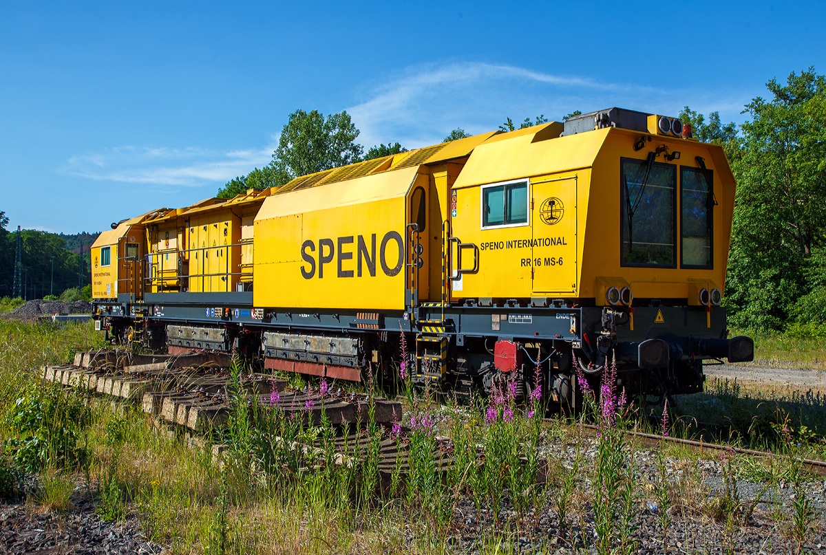Die SPENO Schienenschleifeinheit RR 16 MS-6, Schweres Nebenfahrzeug Nr. 99 84 9127 001-8 NL- SPENO, ist am 13.06.2020 in Betzdorf (Sieg) abgestellt. Zudem ist auch der zugeh. Schutzwagen 31 85 3936 163-0 CH-WASCO, der Gattung Res, beladen mit Werkstatt- und Aufenthaltscontainern, abgestellt.
