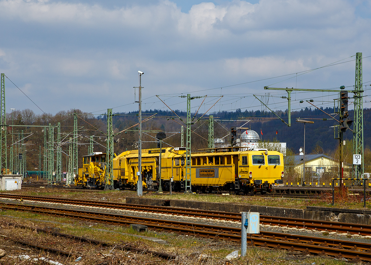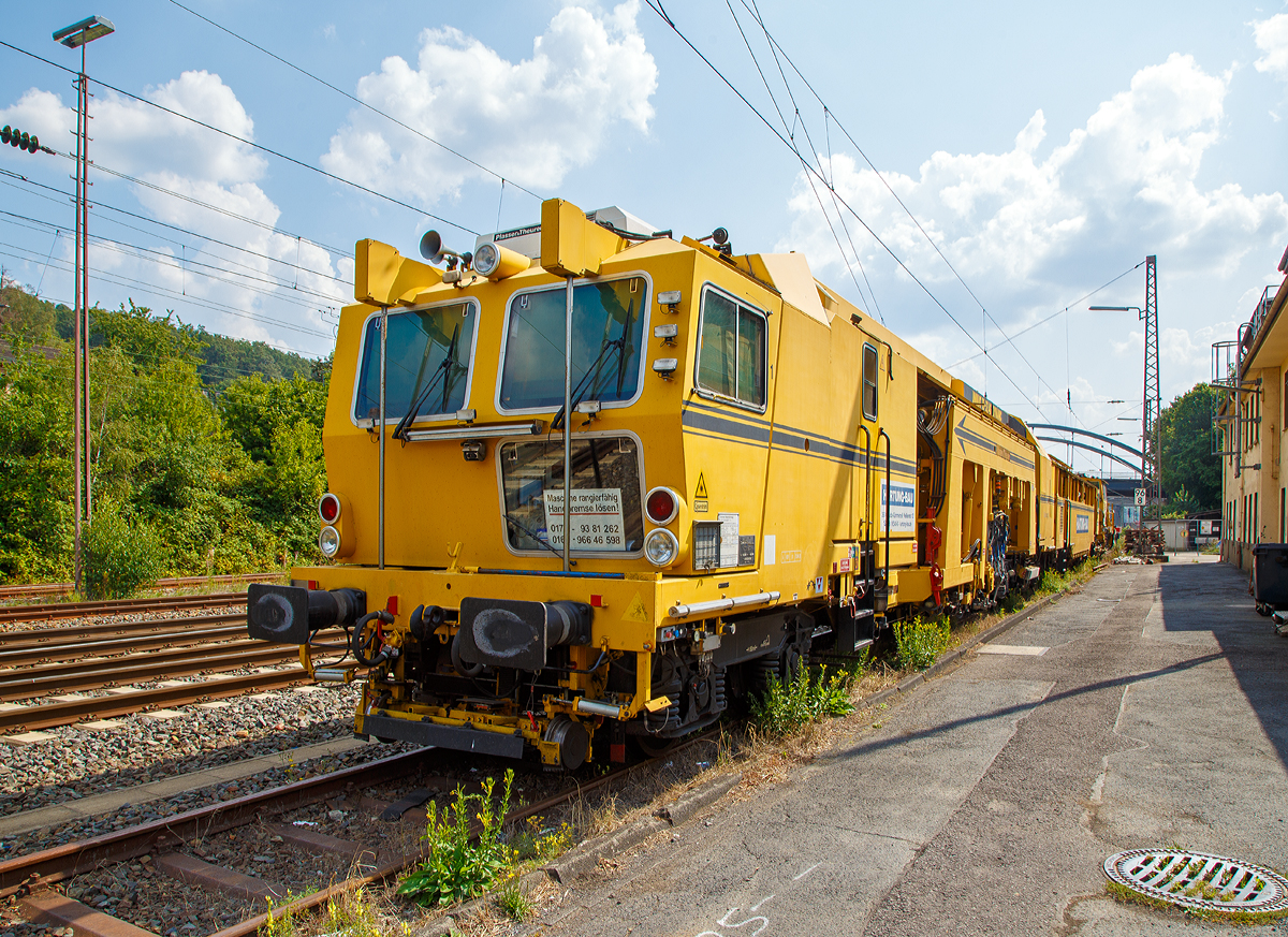 Die Plasser & Theurer Schnell-Schotterplaniermaschine SSP 110 SW, Schweres Nebenfahrzeug Nr. 97 16 46 507 18-8 und die Plasser & Theurer Universalstopfmaschine UNIMAT 09-32/4S DYNAMIC "Alles wird gut!", Schweres Nebenfahrzeug Nr. 97 43 55 505 17-9, beide der Hartung-Bau GmbH (Fulda-Krämmerzell) , sind am 25.08.2019 in Kreuztal abgestellt.