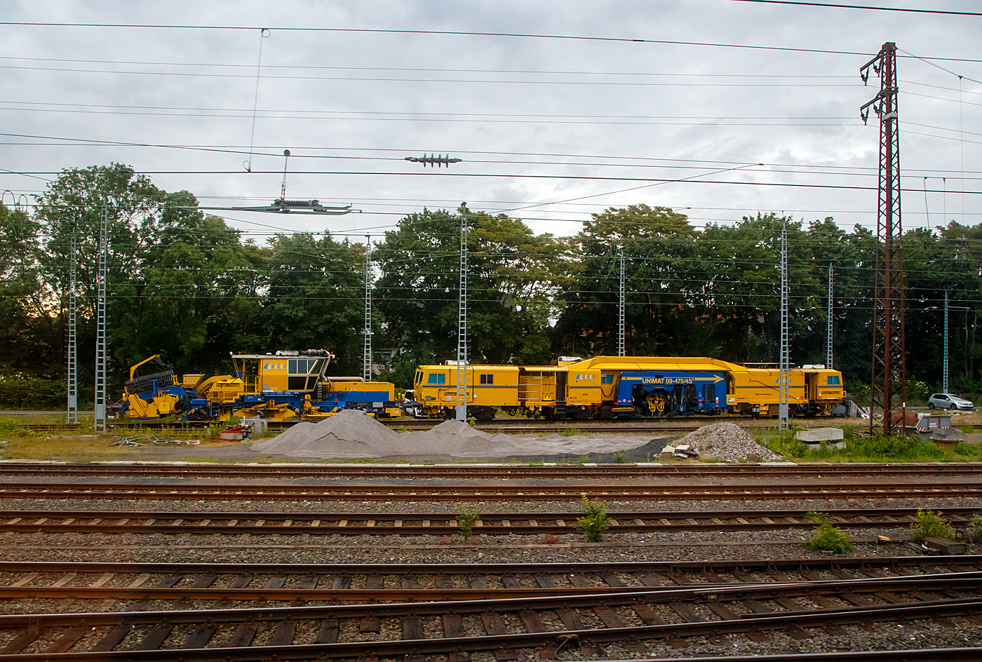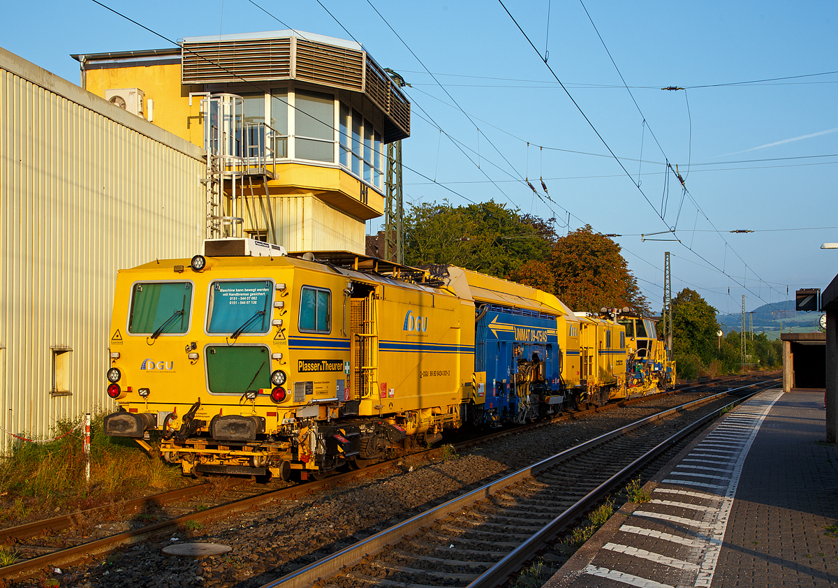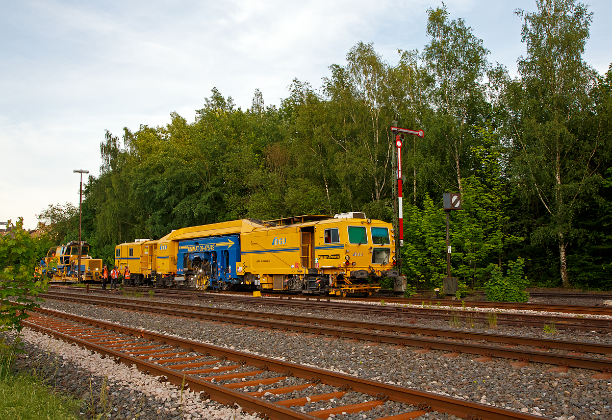 Am 11.06.2021 abgestellt auf dem Gleis 4 im Bahnhof Herdorf: Die Plasser & Theurer Universalstopfmaschine UNIMAT 09-475/4S (Kombinierte Gleis- und Weichenstopfmaschine), Schweres Nebenfahrzeug Nr. D-DGU 99 80 9424 001-2 und dahinter die Plasser & Theurer Schotterverteil- und Planiermaschine SSP 110 SW, Schweres Nebenfahrzeug Nr. D-DGU 99 80 9425 068-0, ex 97 16 46 516 18-9 D-DGU (ex Hering Gleisbau, ex Volker-Rail). Beide Maschinen gehören der der DGU - Deutsche Gleisbau Union aus Koblenz.