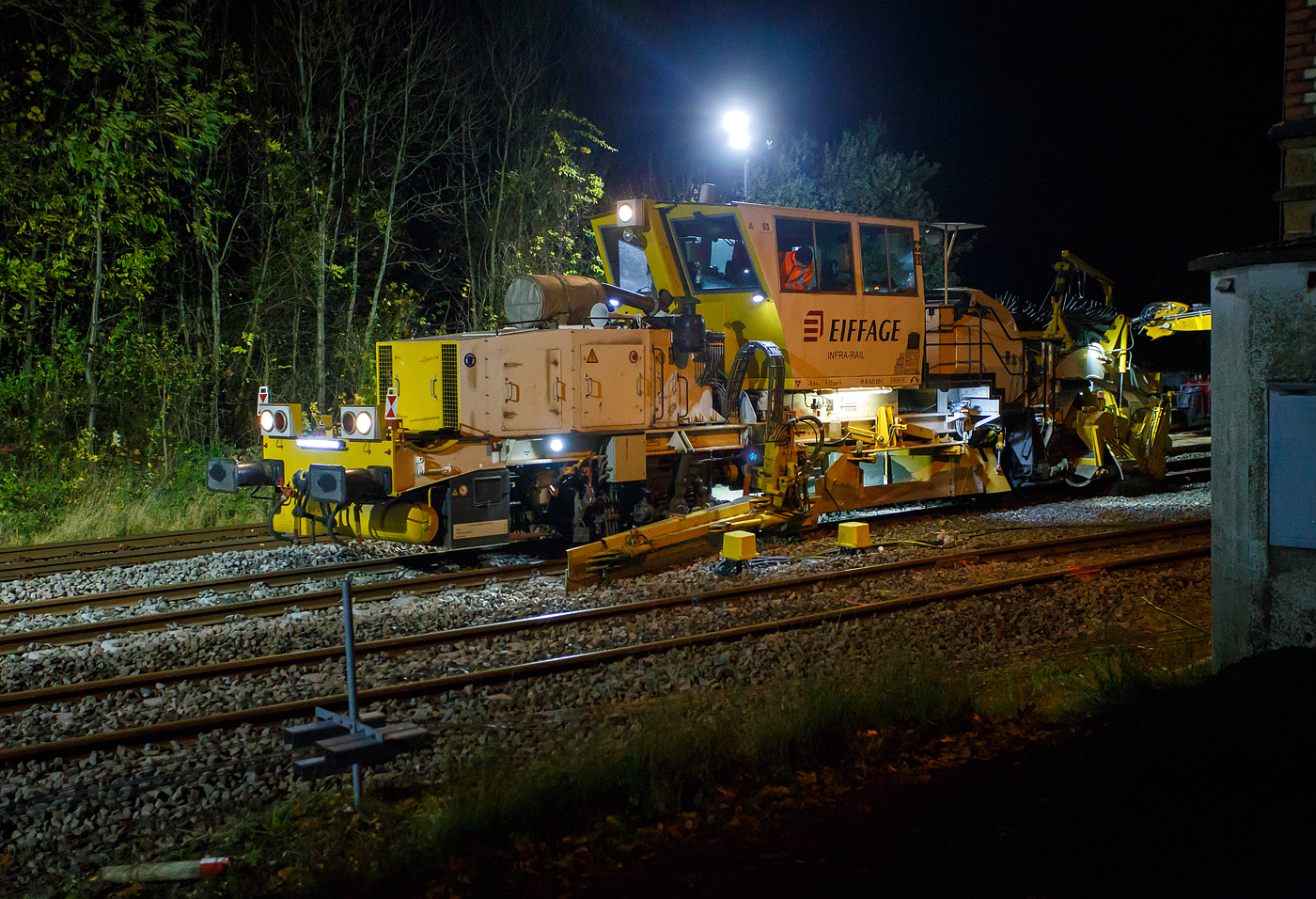 Der Stopfmaschinen folgt am 09 November 2025 im Rbf Betzdorf/Sieg auf dem erneuerte Gleis eine Plasser & Theurer Schotterverteil- und Planiermaschinen SSP 110 D der Spitzke SE (Großbeeren) und stellt den erforderlichen Regelbettungsquerschnitt. Die Maschinen verfüllen, planieren und kehren das Gleis. Sie verfügen über Besenwellen für den Oberbau.