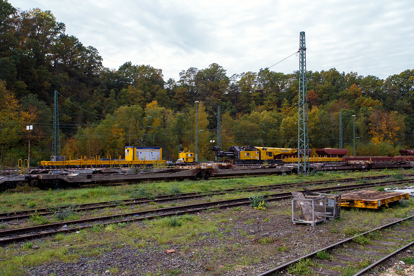Vierachsiger Drehgestell-Flachwagen mit Drehrungen, 37 80 3947 001-8 D-DBG, der Gattung Res, der DB Bahnbau GmbH (noch als DBG - Deutsche Bahn Gleisbau GmbH eingestellt), ist am 14 August 2013 im Rbf Betzdorf/Sieg, gekuppelt mit dem Gleisarbeitsfahrzeug GAF 100 R/A (Schweres Nebenfahrzeug Nr. 97 17 52 112 18-7), abgestellt