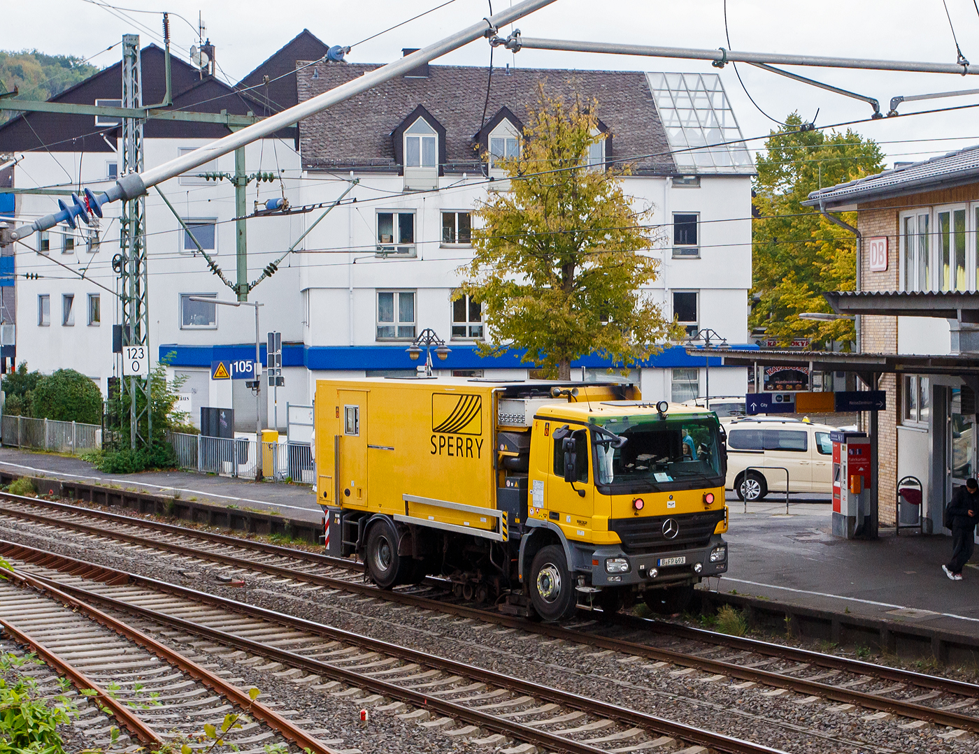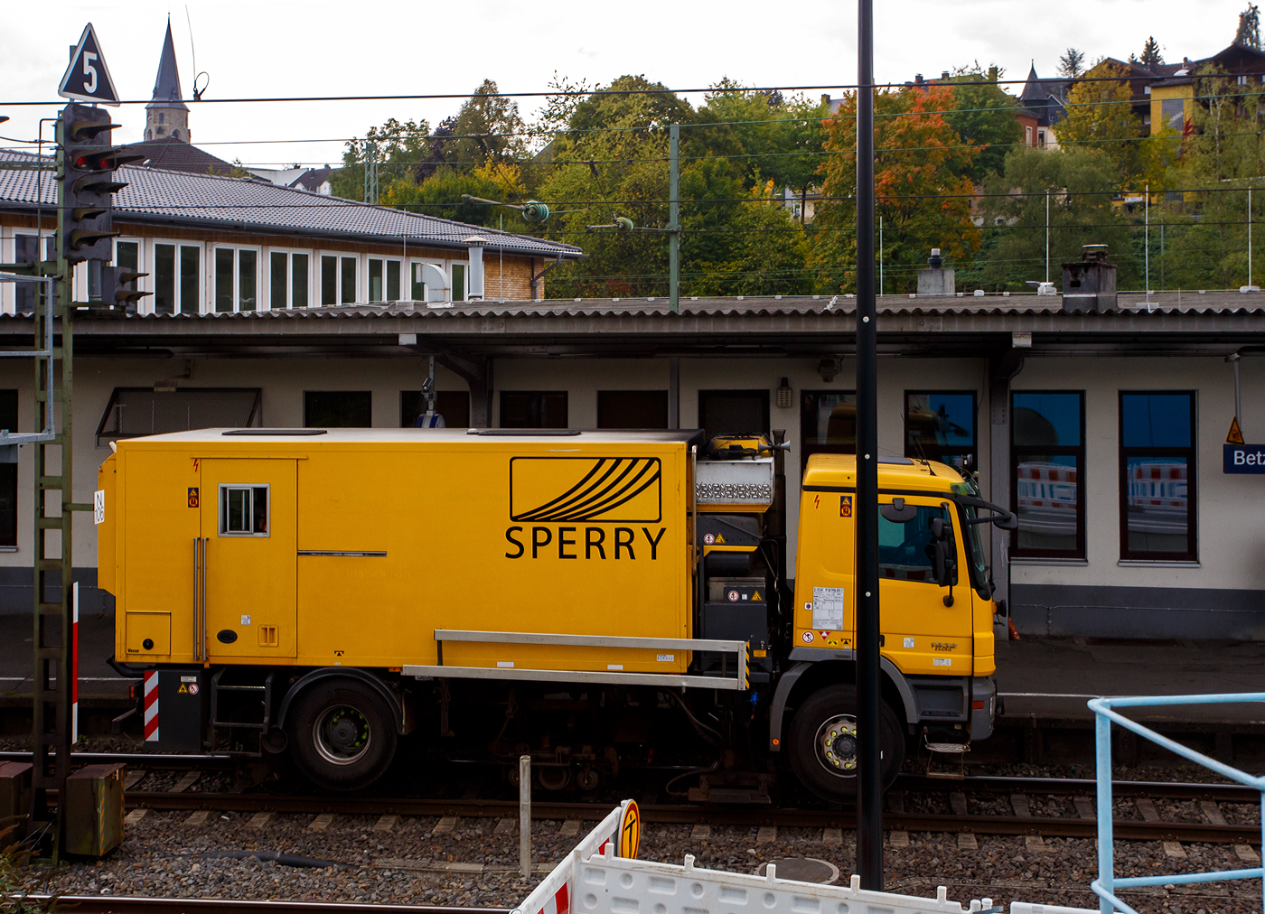 Gleisbaustelle Bf. Herdorf am 13.10.2012 (Erneuerung Gleis 2) - Arbeiter lösen die Schienenbefestigungen, zuvor wurden die Schienen durchgebrannt und das komplette Gleis in Segmenten auf Gleis 3 abgelegt. Mit einem Zweiwegebagger werden Schwellen beiseite gelegt.
