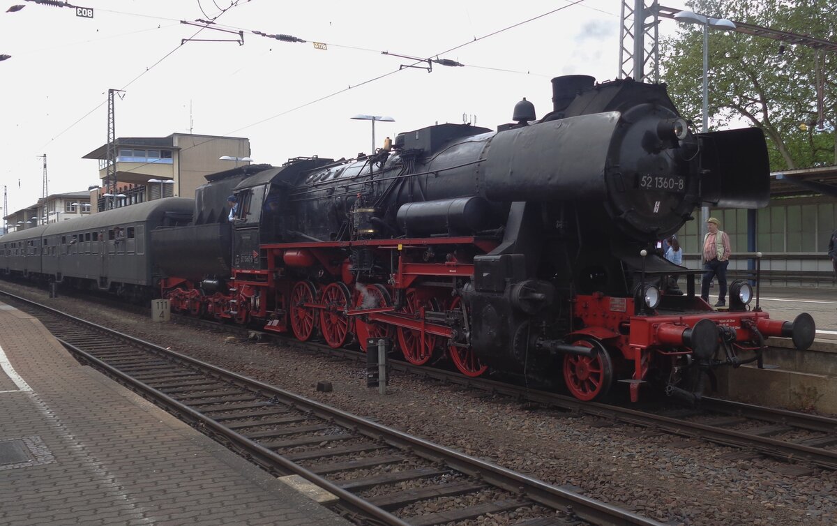 Die Dampflokomotive 52 4867 der HEF (Historische Eisenbahn Frankfurt e. V.), ex GKB 152.4867 (Graz-Köflacher Eisenbahn- und Bergbaugesellschaft), ex ÖBB 152.4867, ex DR 52 4867, beginnt am 31.05.2014 ihre Reise mit Personenzug 79819 vom Bahnhof Neustadt (W) nach Richtung Alsenz.