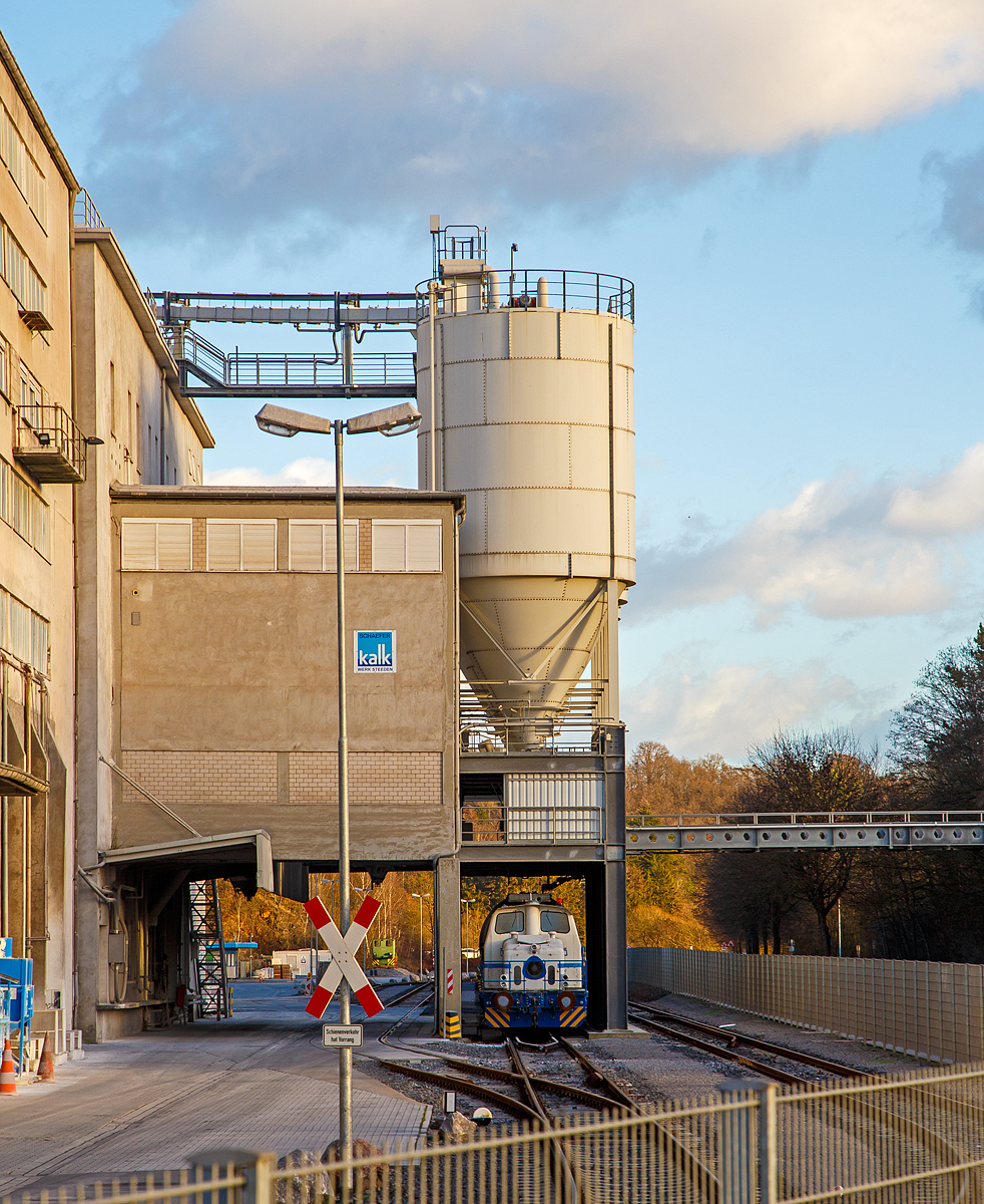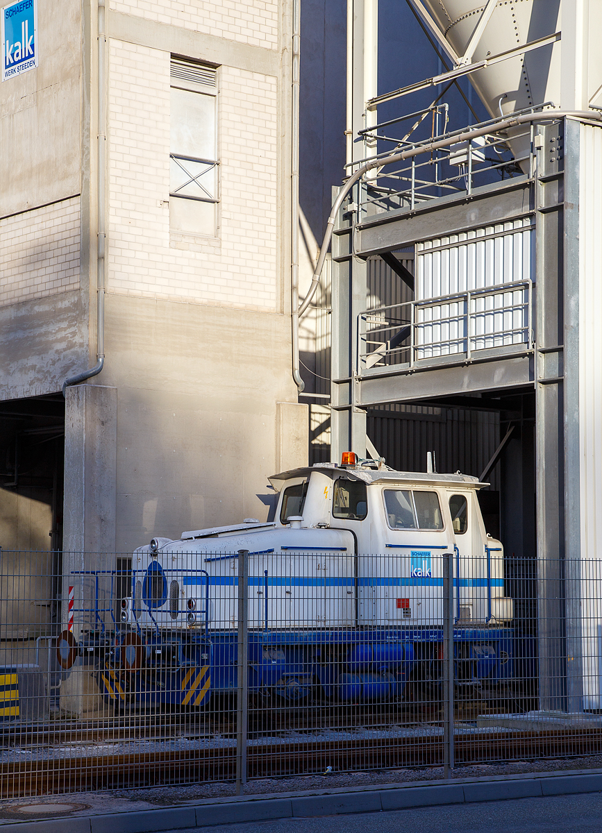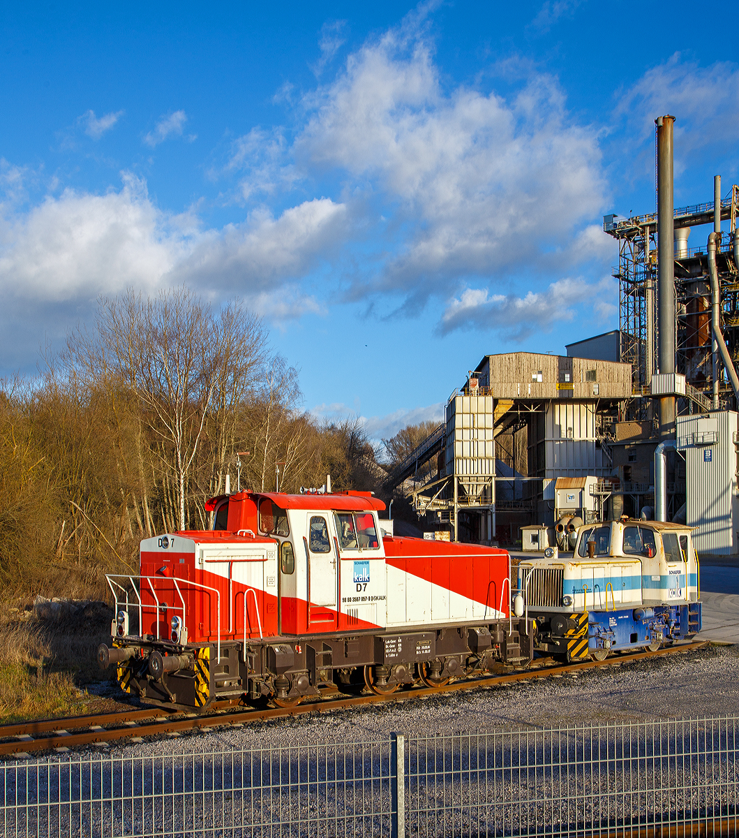Die 3-achsige dieselhydraulische Rangierlokomotive 98 80 3 507 057-8 D-SKALK der Schaefer Kalk GmbH & Co. KG (Werk Steeden), ex HFM D7, eine Krauss-Maffei ML 700 C, am 02.01.2018 in Runkel-Steeden.