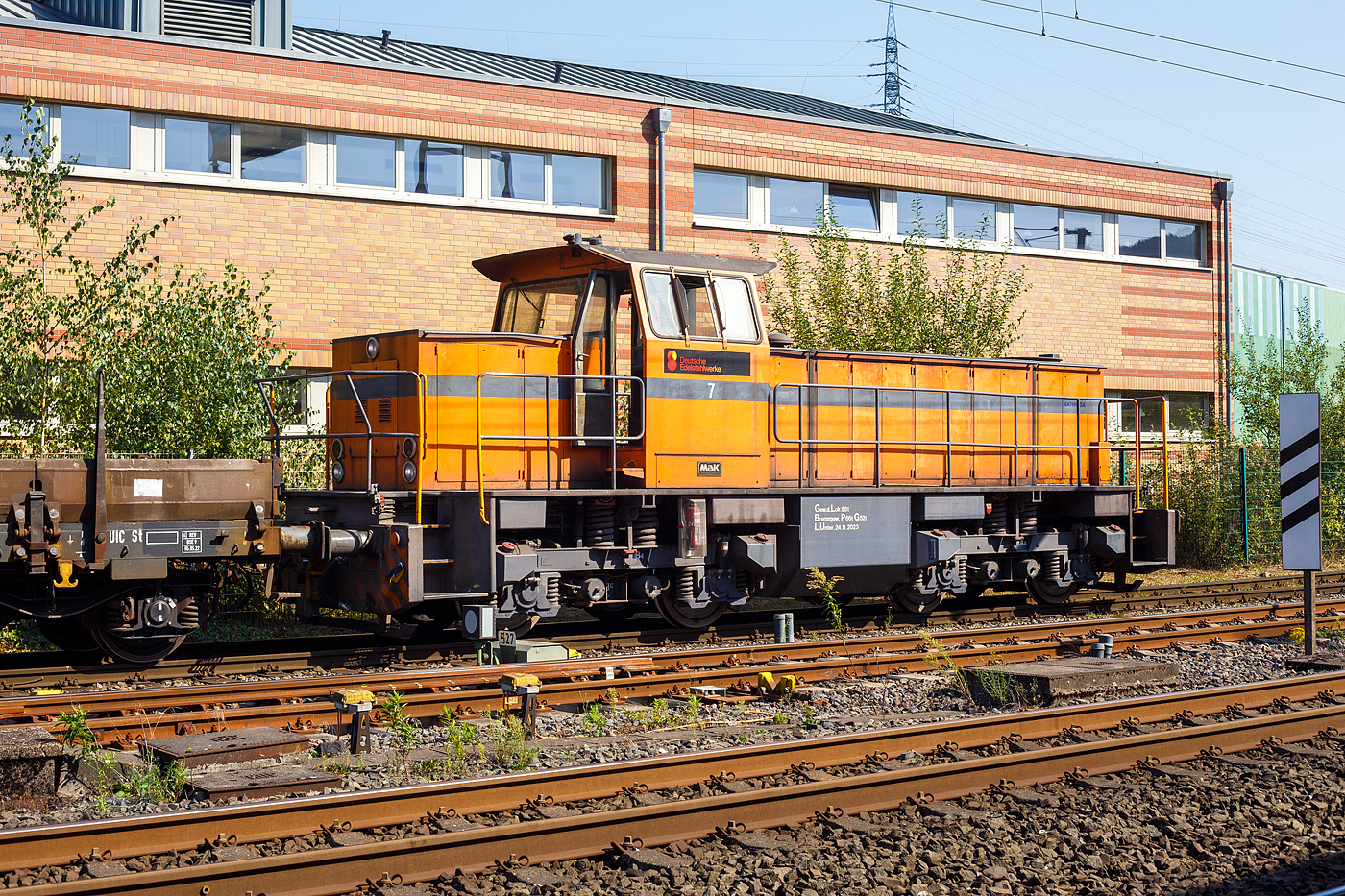 Die V 20.011 (A-StH 92 81 2020 011-0) der Stern & Hafferl Verkehrsgesellschaft m.b.H. (StH), eine 4-achsige normalspurige dieselhydraulische Lokomotive vom Typ MaK G 1203 BB, hat einen Güterzug von Stadl-Paura nach Lambach gebracht, nun setzt sie im Bahnhof Lambach, noch bevor unser ÖBB Zug kommt.