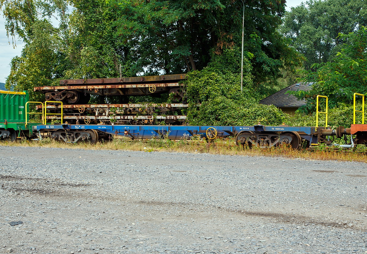 Der meterspurige vierachsige Flachwagen A-StH N 23 421 der Stern & Hafferl Verkehrsgesellschaft m.b.H., ex Brohltalbahn 454, ist am 04 April 2025 beim Bahnhof Vorchdorf-Eggenberg abgestellt.