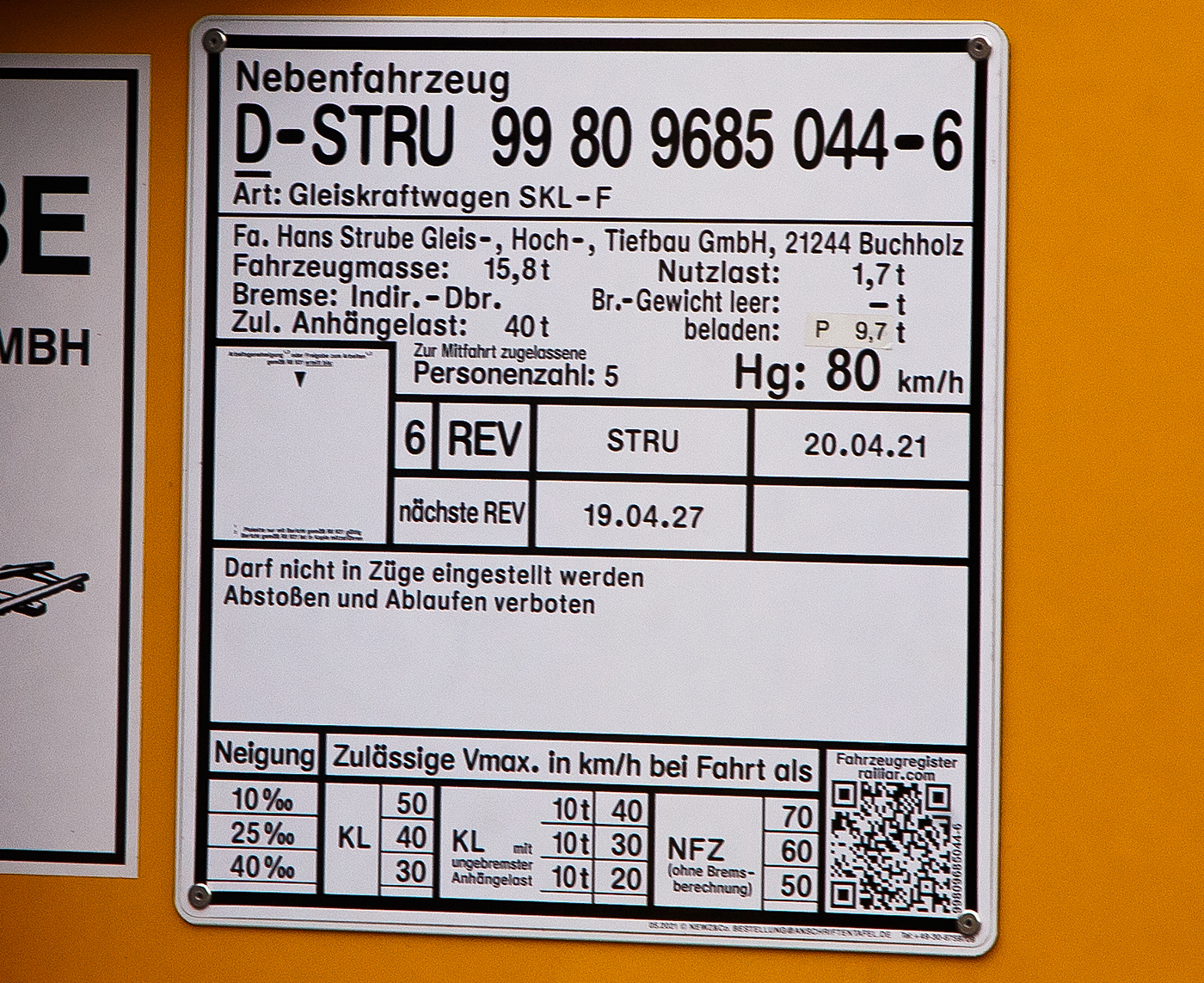 Höchstgeschwindigkeit (eigen): 15 km/h (Arbeit)