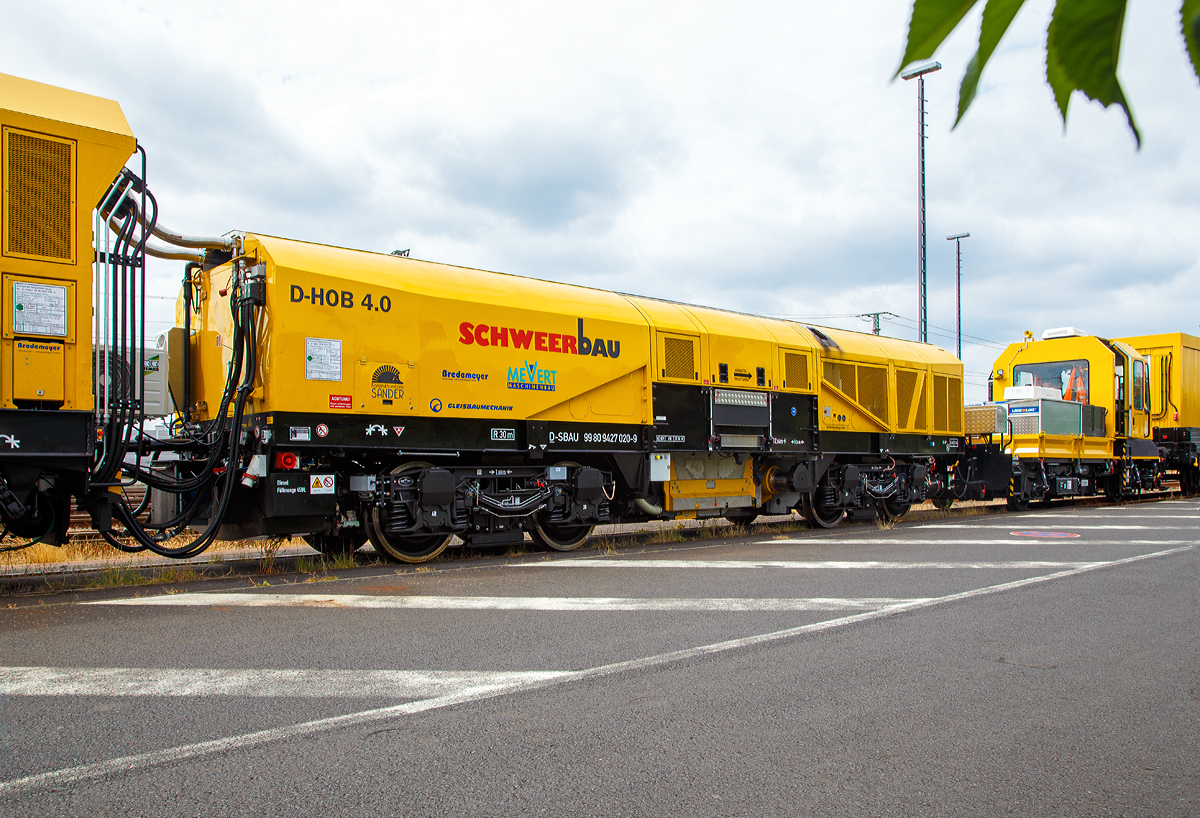 Der Drehhobel D-HOB 2500 IV (D-HOB 4.0) der Schweerbau ist am 07.07.2019 beim ICE-Bahnhof Montabaur abgestellt. Die Einheit besteht aus dem Steuerwagen (Schweres Nebenfahrzeug-Nr. D-SBAU 99 80 9580 003-8) einem ursprünglichen GAF 100 R welches keinen eigenen Antrieb mehr hat, dem Technologieträger D-HOB 2500 IV bzw. D-HOB 4.0 (Drehhobel) Schweres Nebenfahrzeug-Nr. D-SBAU 99 80 9427 020-9) und dem Spänetransportwagen STW 01 Schweres Nebenfahrzeug-Nr. D-SBAU 99 80 9552 100-6. Zudem war noch die LDS 293 511-2 und der 27 80 3302 030-8 D-WSG der Gattung Ks mit aufgesetzten Werkstatt- und Aufenthaltscontainer dort abgestellt.