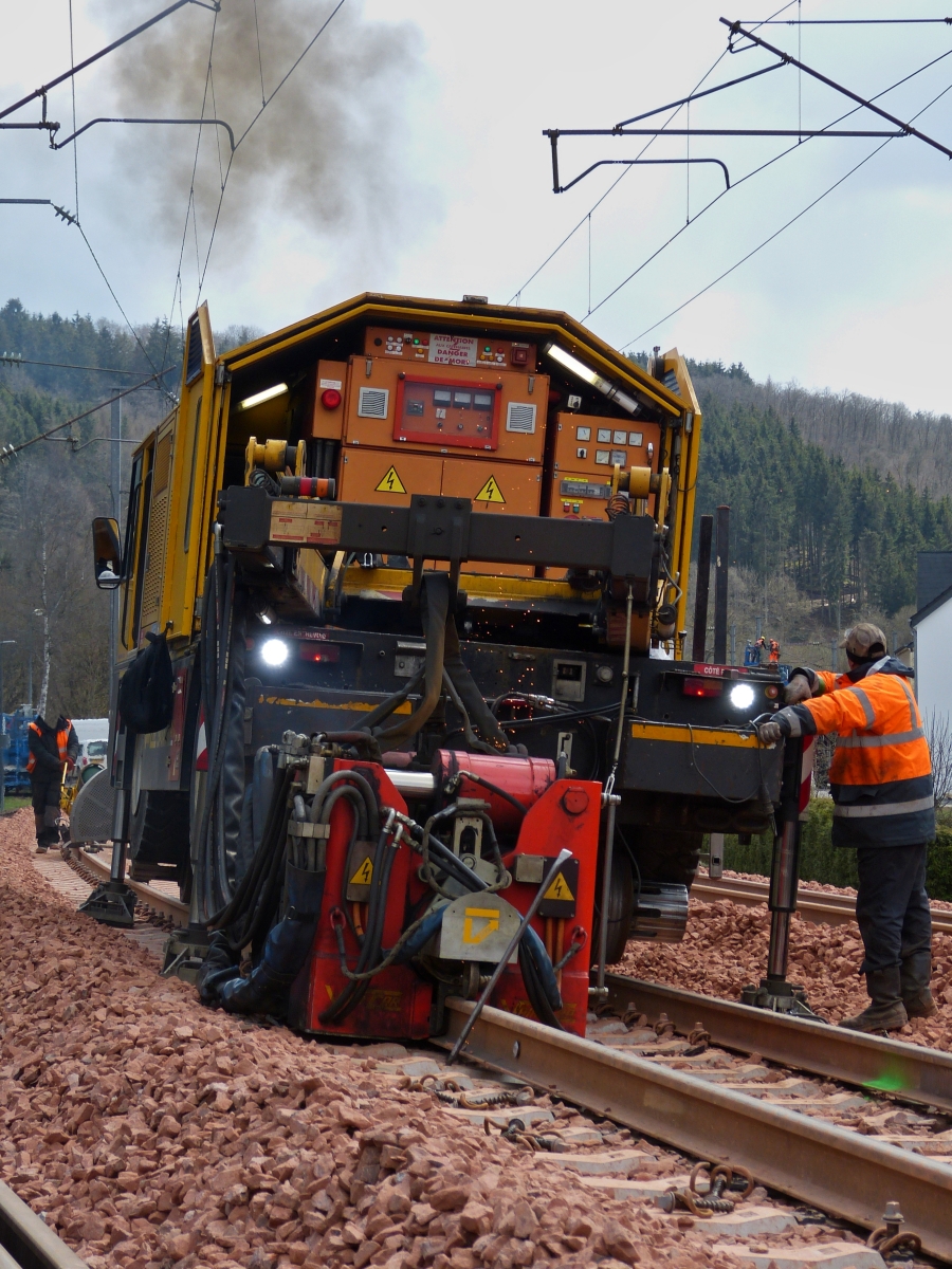 Den versuch die Länge des Gleisumbauzuges in einem Bild festzuhalten kann ich vergessen, Während Lok 2016 906 mit 6 vollbeladenen Siloschotterwagen an Mecher in Richtung Clervaux zum entladen unterwegs ist, zieht Lok 2016 905 den Gleisumbauzug imSchneckentempo über die Gleisbaustelle beim Kaaspelterhof in Richtung Drauffelt. Bild aufgenommen von der Straße Mecher – Weicherdange über dem Tunnel. 06.04.2021