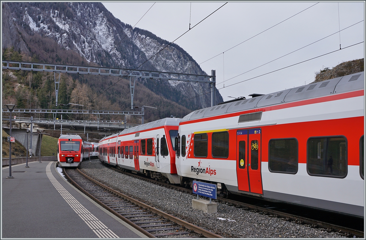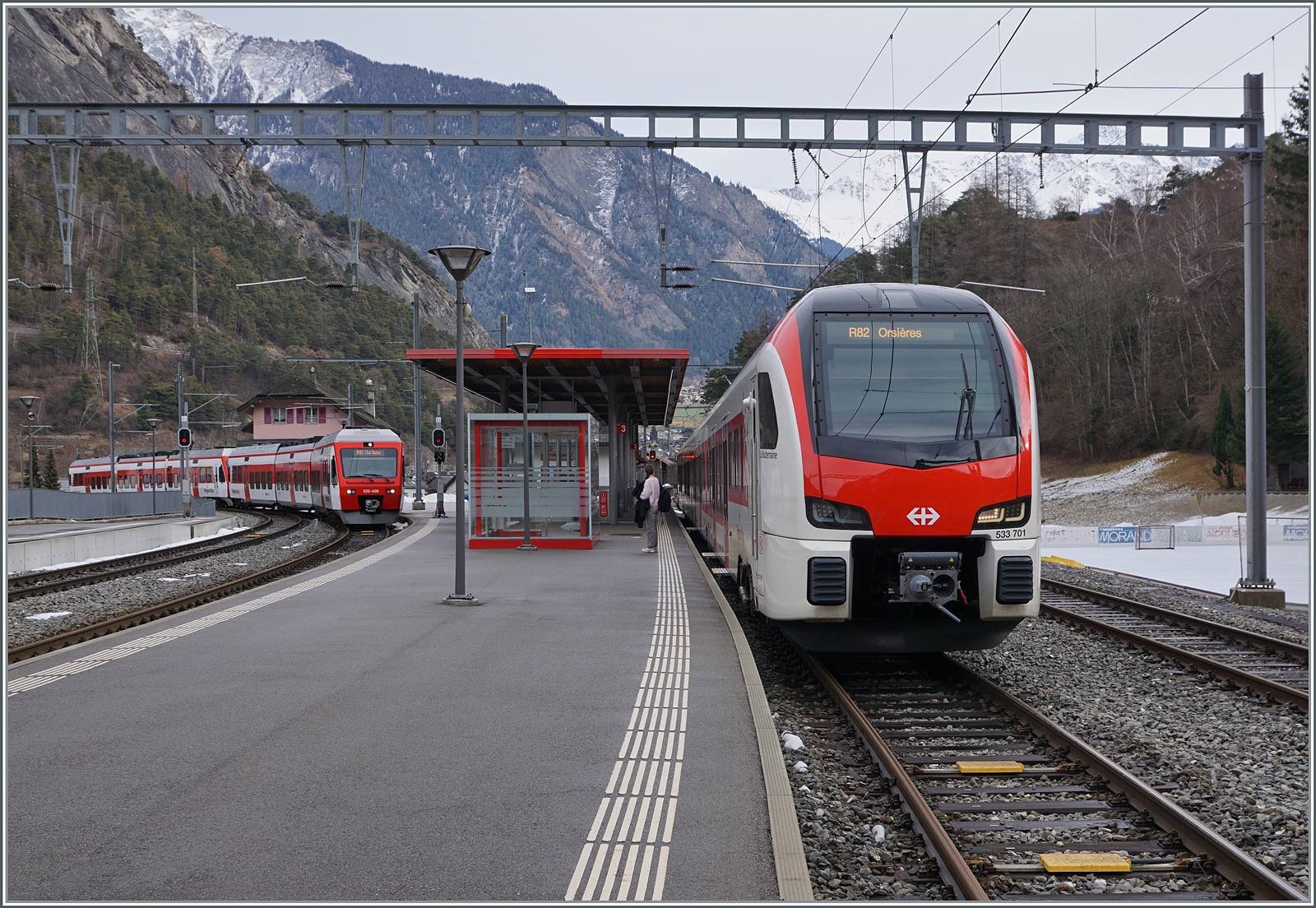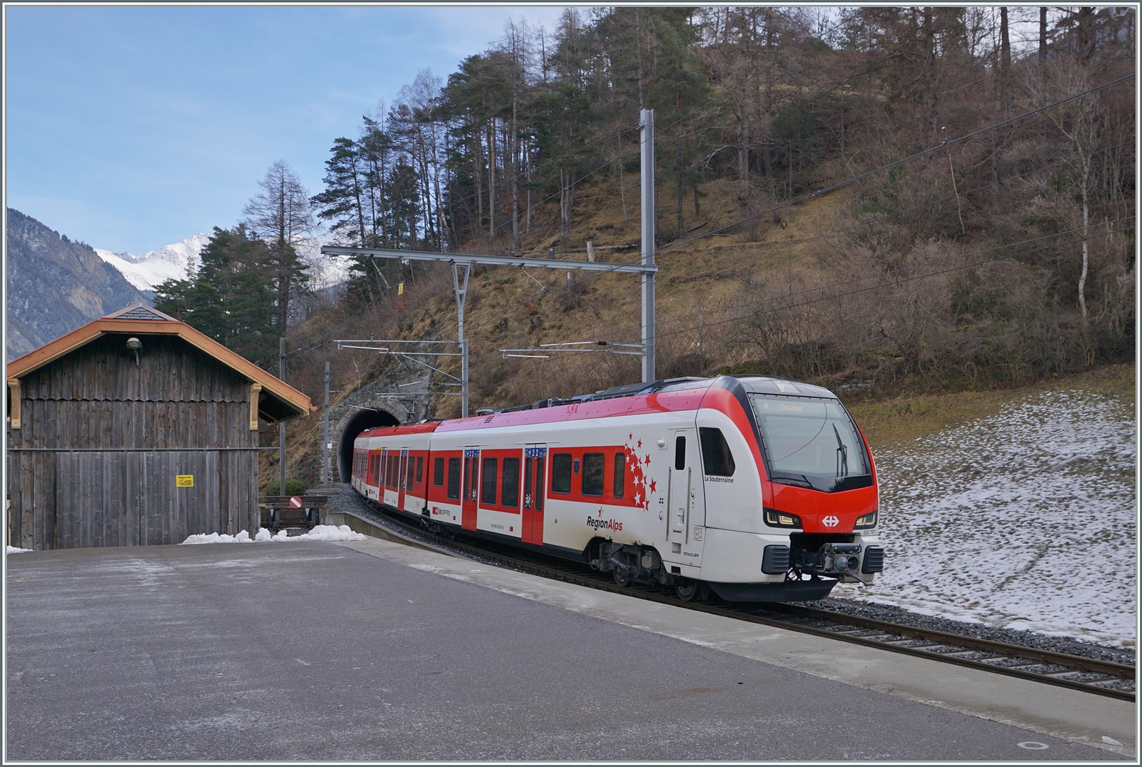 Der SBB RABe 511 110 ist als IR von Genève nach Le Châble (-Verbier) unterwegs und konnte kurz vor der Ankunft in Le Châble fotografiert werden. Bis Martigny verkehrt dieser Zug mit einem weiteren RABe 511, dort wird dann geflügelt.