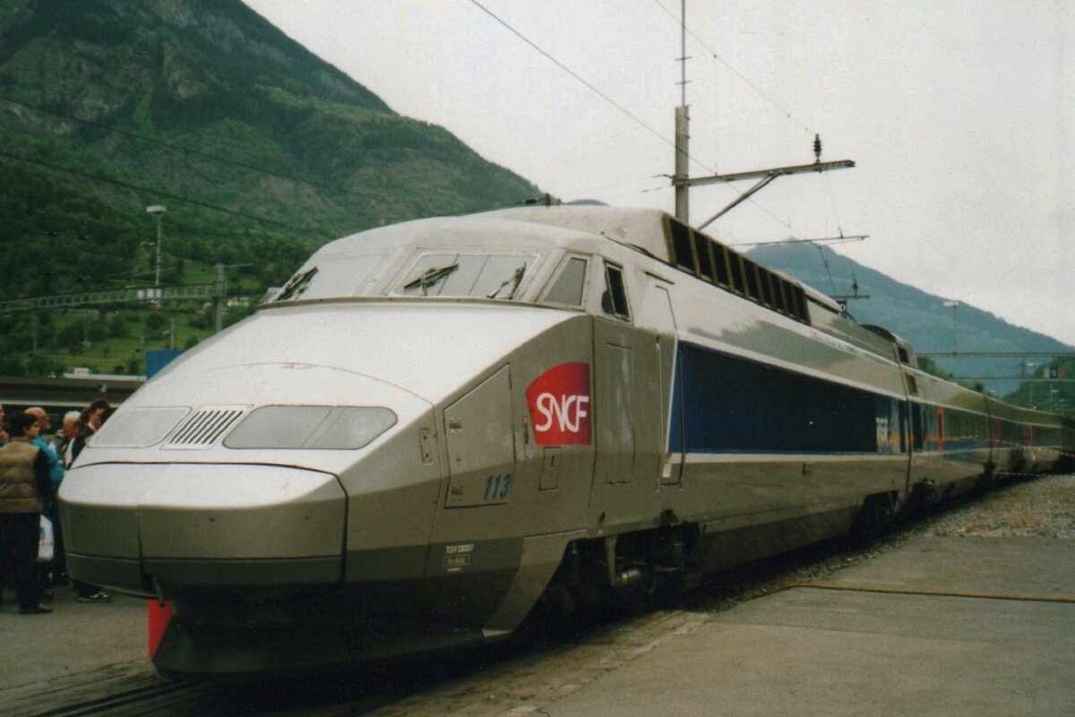 TGV Lyria (Tz 112) der Verbindung Paris–Dijon–Lausanne–Brig bediehnt, er fährt hier am 26.02.2012 bei Clos du Moulin am Genfersee Richtung Brig entlang, hinten Château de Chillon, dahinter Montreux.