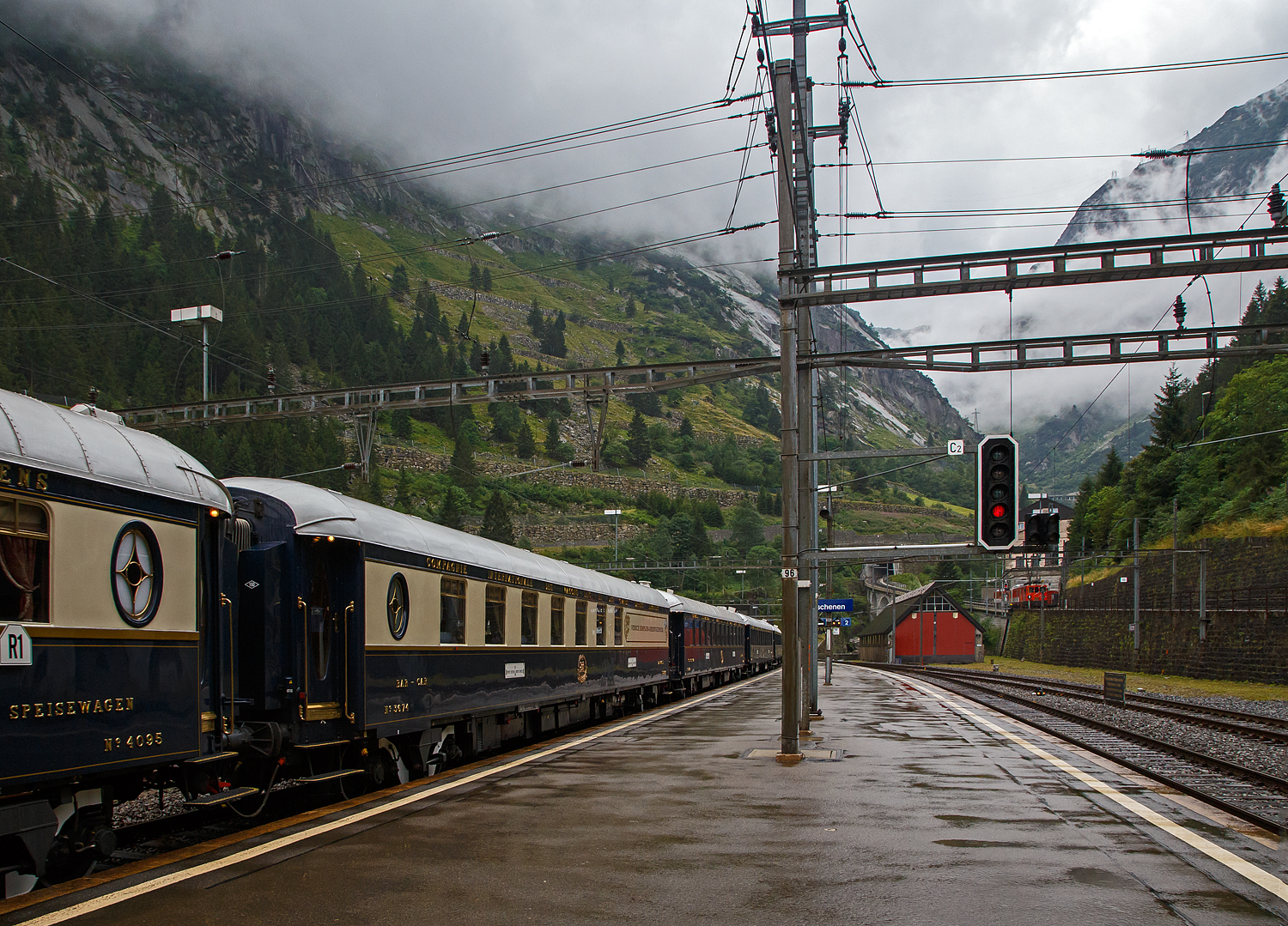 Der VSOE Pullman Typ "Étoile du Nord" Speisewagen mit Küche N° 4095 (F- VSOE 61 87 08-70 095-9 [P]), ex CIWL 4095, im Zugverbund vom Venice Simplon-Orient-Express am 02.08.2019 beim Halt in Göschenen (CH), leider bei Regen.