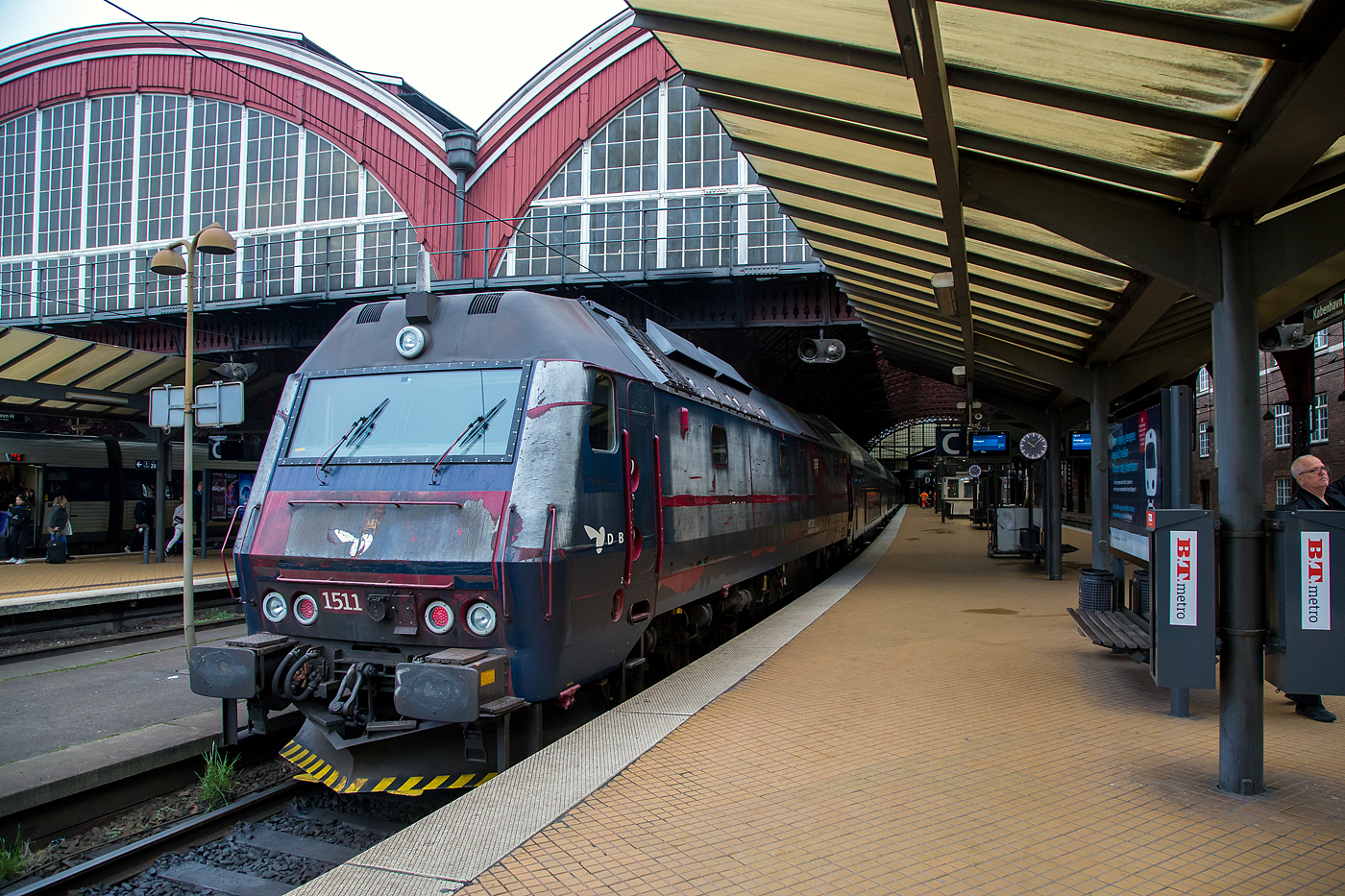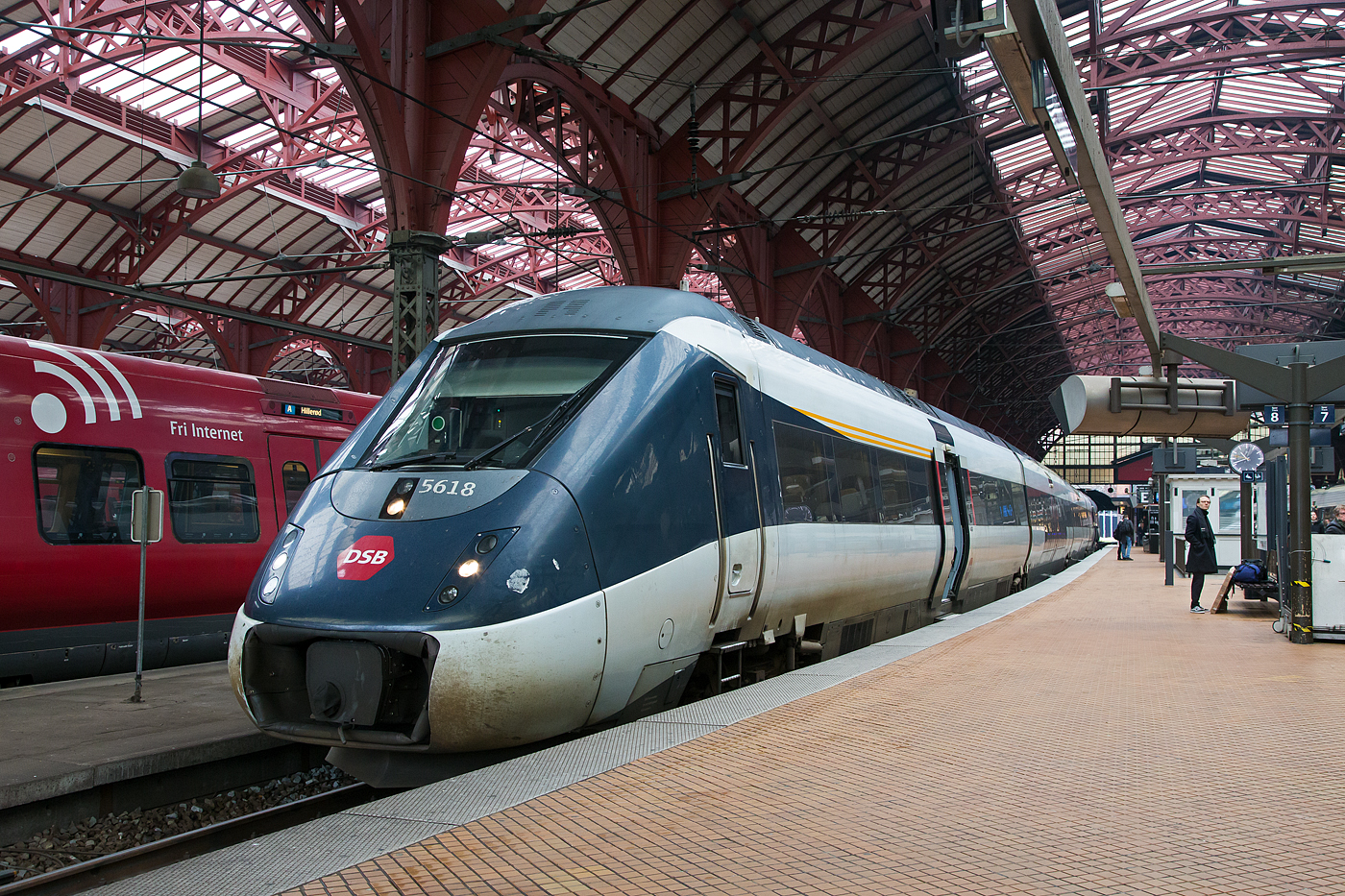 Schweizer Technik in Skandinavien, hier in der dänischen Hauptstadt Kopenhagen beim Københavns Hovedbanegård (Kopenhagen Hauptbahnhof) über den Gleisen der S-Bahn (S-tog, dänisch für S-Zug) sind Deckenstromschiene CR von Furrer+Frey (Bern) verbaut, wie hier am 20 März 2019 zusehen.