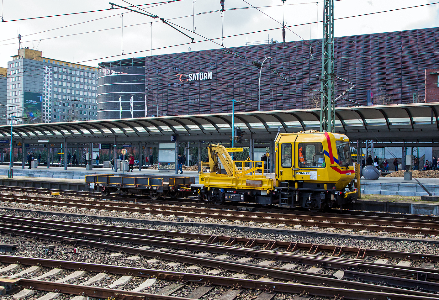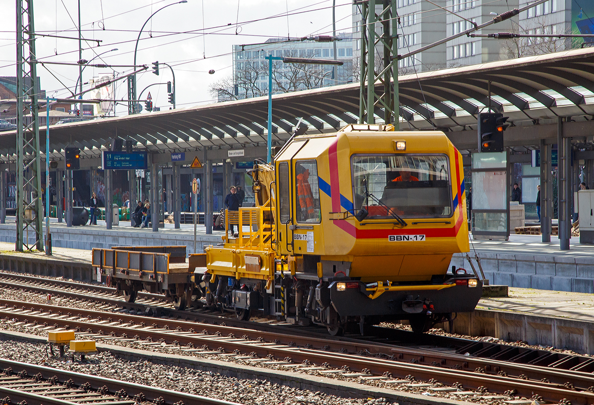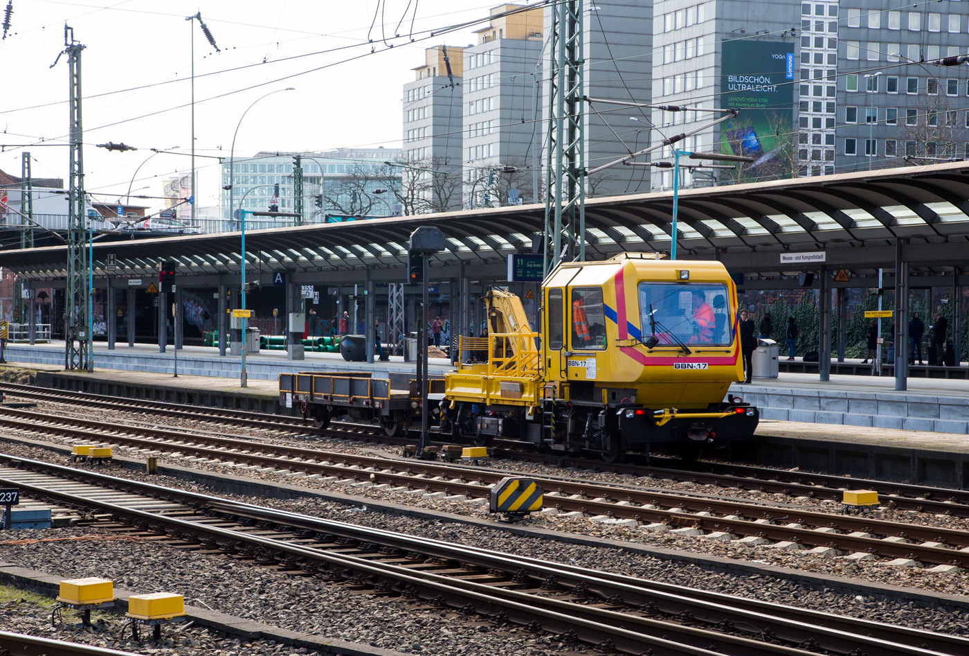 BBN-17, ein Gleiskraftwagen SKL 26 LK, Schweres Nebenfahrzeug Nr. 29.1.045, der Bahnbau Nord GmbH (Henstedt-Ulzburg), ex DR 29.1.045, mit einem Gleiskraftwagenanhänger, fährt am 19.03.2019 durch den Hbf Hamburg. Das Fahrzeug wurde 1993 von GBM unter der Fabriknummer 29.1.045 gebaut.