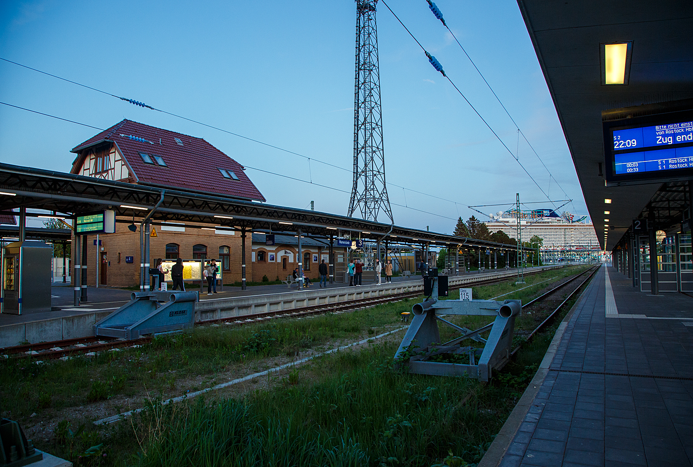 Bahnhof Warnemünde am 15 Mai 2022 am Abend, hier rechts die Bahnsteige für die S-Bahn.