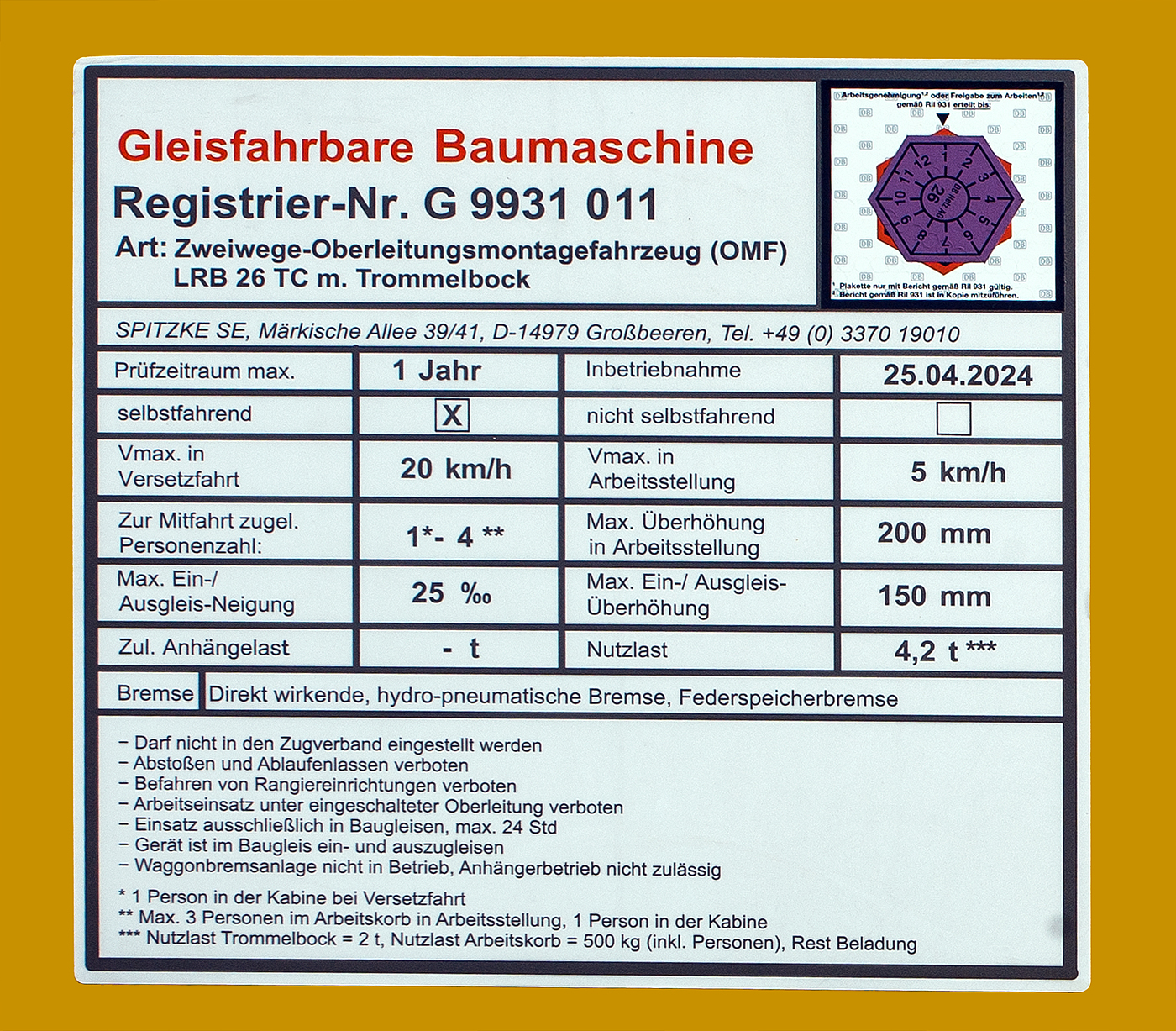 Anschriftentafel von dem Caterpillar CAT M323F Zweiwegebagger mit hydrostatischem Schienenradantrieb (Serien-Nr. RH600 160), Kleinwagen Nr. D-ZBM 99 80 9902 510-3 der ZEPPELIN Baumaschinen GmbH (Garching) abgestellt am 01.04.2023 beim Hp Grünebach Ort (an der Hellertalbahn).