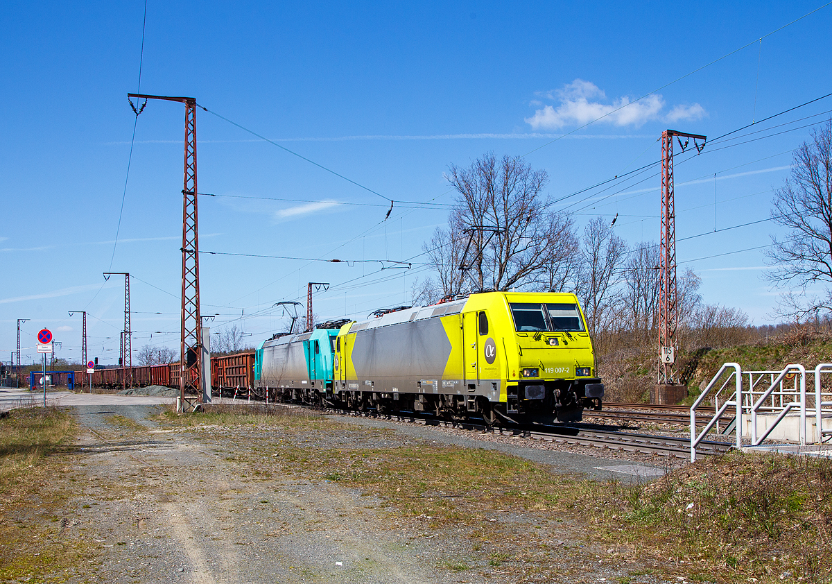 Die DE 2700-01 (92 80 1251 001-4D-BEBRA) und DE 2700-10 (92 80 1251 010-5 D-BEBRA) beide der HGL - Holzlogistik und Güterbahn GmbH, Bebra / Pronto Rail stehen am 08 Dezember 2020 bei der Werkstatt der Uwe Adam EVU GmbH in Eisennach (Aufnahme auch einem ICE).