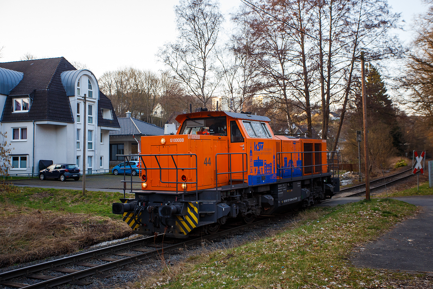 Die KSW 44 (92 80 1271 004-4 D-KSW), eine MaK G 1000 BB der KSW (Kreisbahn Siegen-Wittgenstein) kommt am 26 Februar 2026 in Neunkirchen-Salchendorf solo vom Pfannenberg (ehemals Grube Pfannenberger Einigkeit), wo sich heute die Produktionshallen der EMW Stahl Service GmbH, ein Geschäftsbereich der SCHÄFER WERKE Gruppe befinden, hinunter um unten weitere beladen Coilwagen in Salchendorf zu holen.