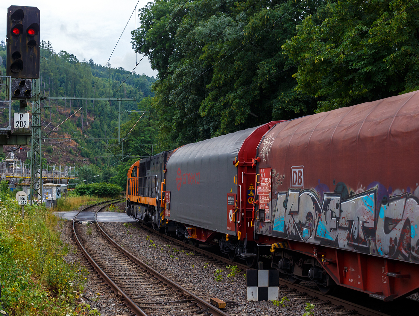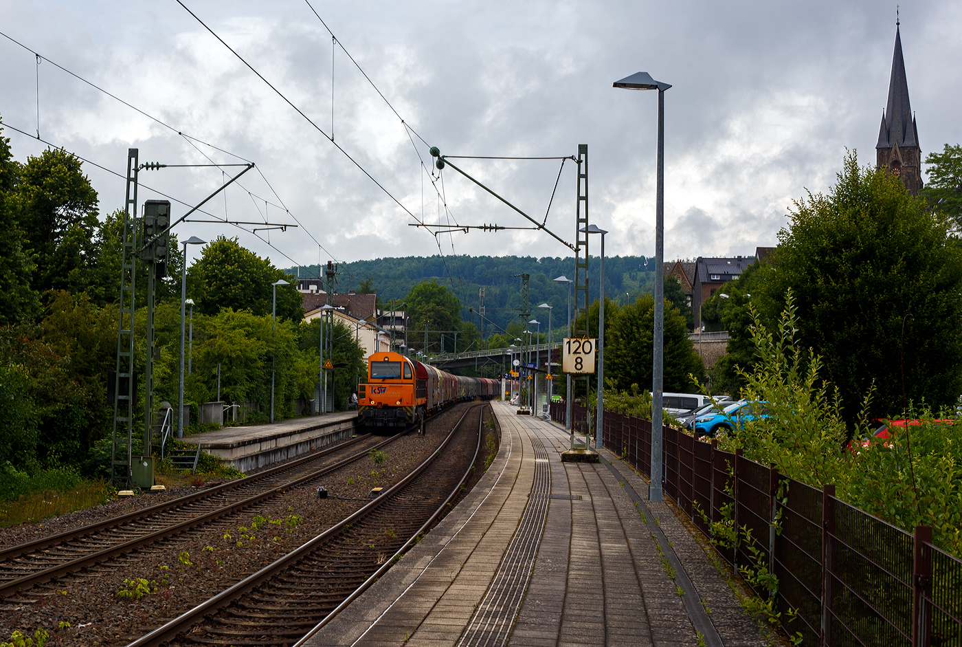 Und tschüss bis gleich in Herdorf, die KSW 43 (92 80 1273 018-2 D-KSW), die asymmetrische Vossloh G 2000 BB der KSW (Kreisbahn Siegen-Wittgenstein) fährt am 03 Juli 2024, mit einem beladen Coilzug (16 Stück VTG Coilwagen der Gattung Shimmns-ttu, VTG Bez. F46.520D) vom Hafen Duisburg kommend, durch den Bahnhof Scheuerfeld(Sieg) in Richtung Herdorf via Betzdorf.