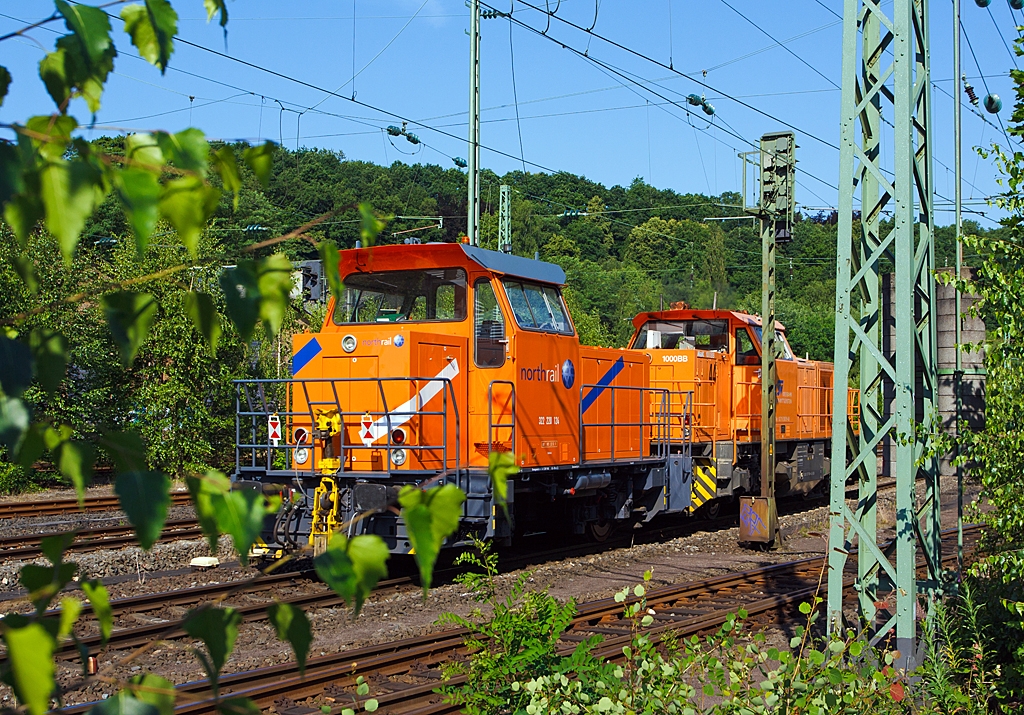 Hier habe ich heute lange überlegt, ob ich es überhaupt zeigen soll (Motiv verdeckt) – Leider konnte ich sie nur noch durch die Büsche als Nachschuss erwischen -Aber diese Lok sieht man wohl kaum auf DB Gleisen (Sie hat keine NVR-Nummer) – Die northrail 322 220 126, ex DSB MK 607, ex DB Schenker Rail Danmark Services A/S MK 607, eine SFT G 322 B wird von der KSW (Kreisbahn Siegen-Wittgenstein) Lok 44 am 08.07.2013 durch Betzdorf/Sieg in Richtung Köln gezogen. Die G 322 B wurde 1997 unter der Fabriknummer 220126 bei SFT in Kiel gebaut und an die DSB (Danske Statsbaner / Dänische Staatsbahnen) geliefert. Technische Daten: Spurweite: 1435 mm Achsfolge: B Länge über Puffer: 9.400 mm Achsstand: 4.000 mm größte Breite: 3.100 mm kleinster befahrbarer Gleisbogen: 50 m Dienstgewicht: 40 t Motor : MTU Typ 8V183TD13 Leistung: 390 kW bie 2.100 Upm Getriebe : Voith, Typ L2r4zseU2 Höchstgeschwindigkeit: 60 km/h gebaute Stückzahl: 26 SFT = Siemens Schienenfahrzeugtechnik, ehem. Krupp Verkehrstechnik GmbH, heute VSFT = Vossloh Schienenfahrzeugtechnik GmbH Nach der Übernahme des Lokbaus durch VSFT wurde die G 322 aus dem 3. Typenprogramm als Mak G 400 B bezeichnet. Es wurden zwei Serien mit insgesamt 19 Lokomotiven aufgelegt, wobei es gegenüber den G 322 einige technische Änderungen, z. B. andere Radsatzgetriebe, gab.
