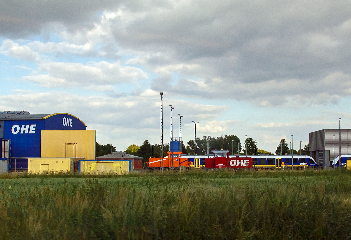 Rechts die OHE 60025 wurde 1996 unter der Fabriknummer 220121 von der SFT (Siemens Schienenfahrzeugtechnik) in Kiel gebaut und an die DSB (Danske Statsbaner / Dänische Staatsbahnen) als MK 602 geliefert. 2002 ging sie VSFT - Vossloh Schienenfahrzeugtechnik GmbH und 2003 wurde sie an die OHE - Osthannoversche Eisenbahnen AG (Celle) für den Verschub im Depot Uelzen verkauft.