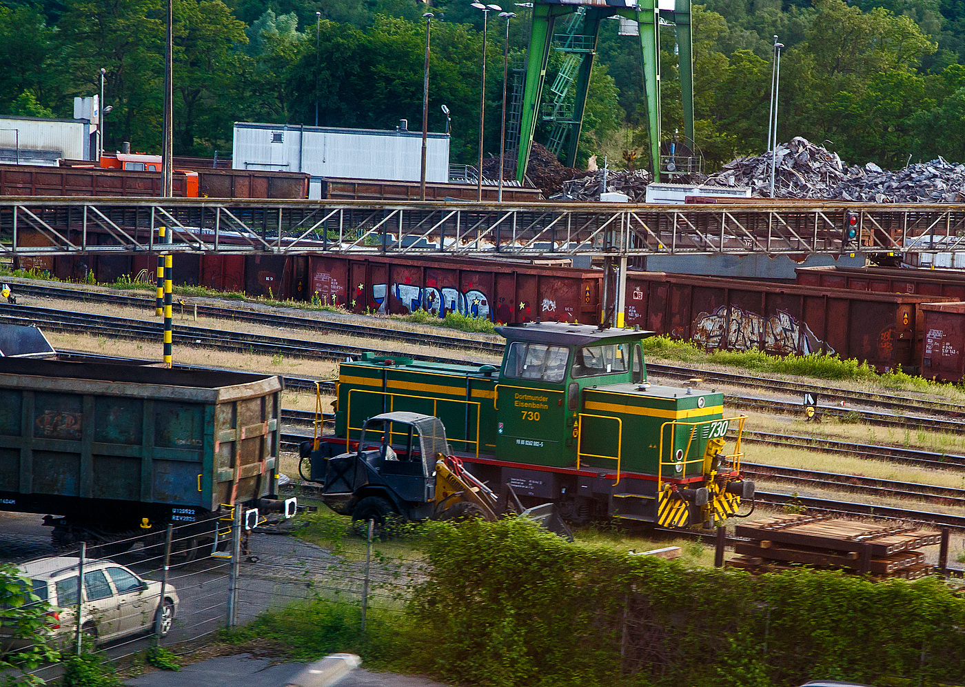 Die DE 730 der Dortmunder Eisenbahn GmbH (98 80 0262 002-5 D-DE), ex Krupp Stahl AG (Werk Bochum) KS-WB 631, eine MaK G 761 C, am 31.05.2022 bei Dortmund. Aufnahme aus dem Zug heraus.