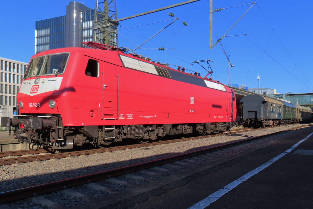 Die 120 120-1 (91 80 6120 120-1 D-BLC) der Bahnlogistik24 GmbH, Dresden (über die Nürnberger Leasing GmbH geleast) fährt am 16.05.2022 (um 23.33 Uhr), mit einem langen Containerzug, von der Siegstrecke kommend durch den Bahnhof Siegburg/Bonn in Richtung Köln.