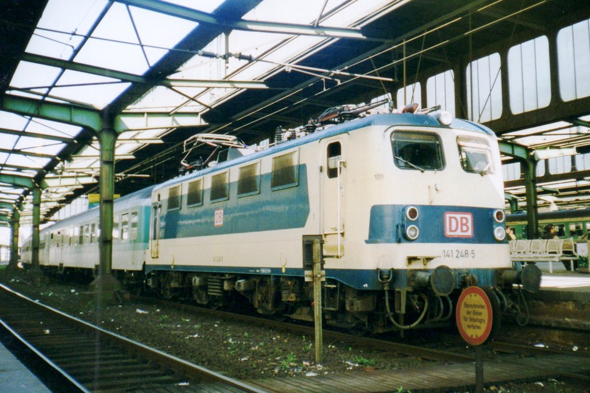 Die 141 248-5, ex DB E 41 248, wird am 20.08.2016 beim Lokschuppenfest vom Südwestfälischen Eisenbahnmuseums in Siegen vor dem Ringlokschuppen präsentiert. Nach nun nach 16 Jahren in „Verkehrsrot“ wieder in der Sonderlackierung des "Karlsruher Zuges", so war sie früher auch sehr oft auf der Ruhr-Sieg und der Dill-Strecke zu sehen. Sie war auch die einzige in dieser Versuchslackierung zum Karlsruher Wendezug (grün-beige), diesen trug sie 1977 bis 2000.
