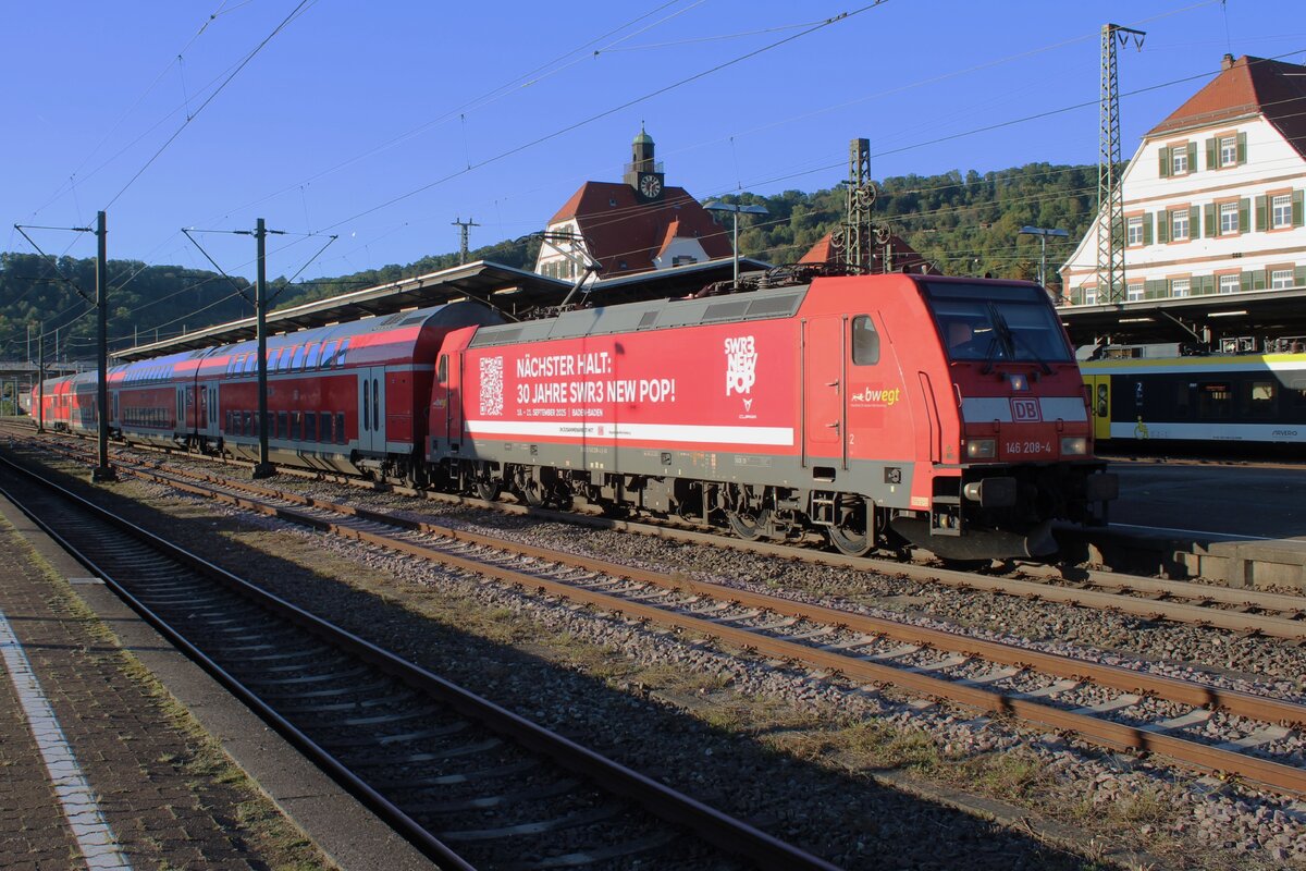 Am 19 September 2025 schiebt DB 146 208 ein RE nach Stuttgart Hbf aus Göppingen.