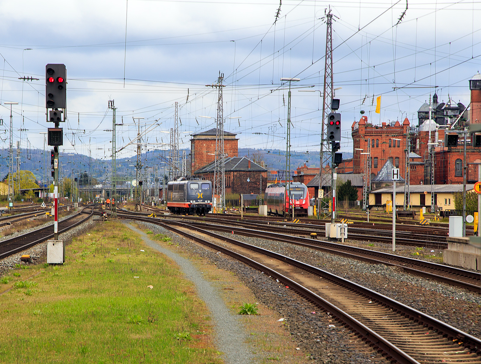 Die 185 361-3 (91 80 6185 361-3 D-DB) der DB Cargo AG fährt am 27.04.2023 mit einem gemischten Güterzug durch den Bahnhof Bamberg.