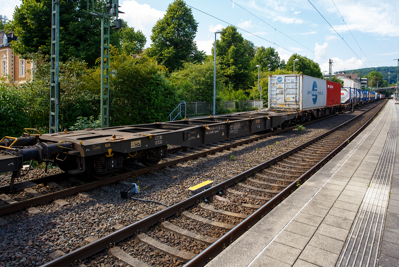 Leerer vierachsiger Drehgestell-Containertragwagen 31 80 4578 206-2 D-KOMBI, der Gattung Sgmnss, der Kombiverkehr GmbH & Co KG (Frankfurt am Main), am 30 Juli 2025 im Zugverband bei der Zugdurchfahrt in Kirchen/Sieg.