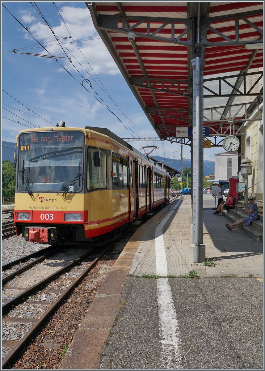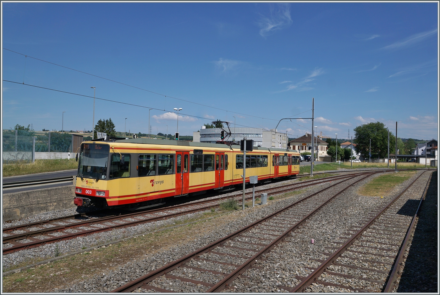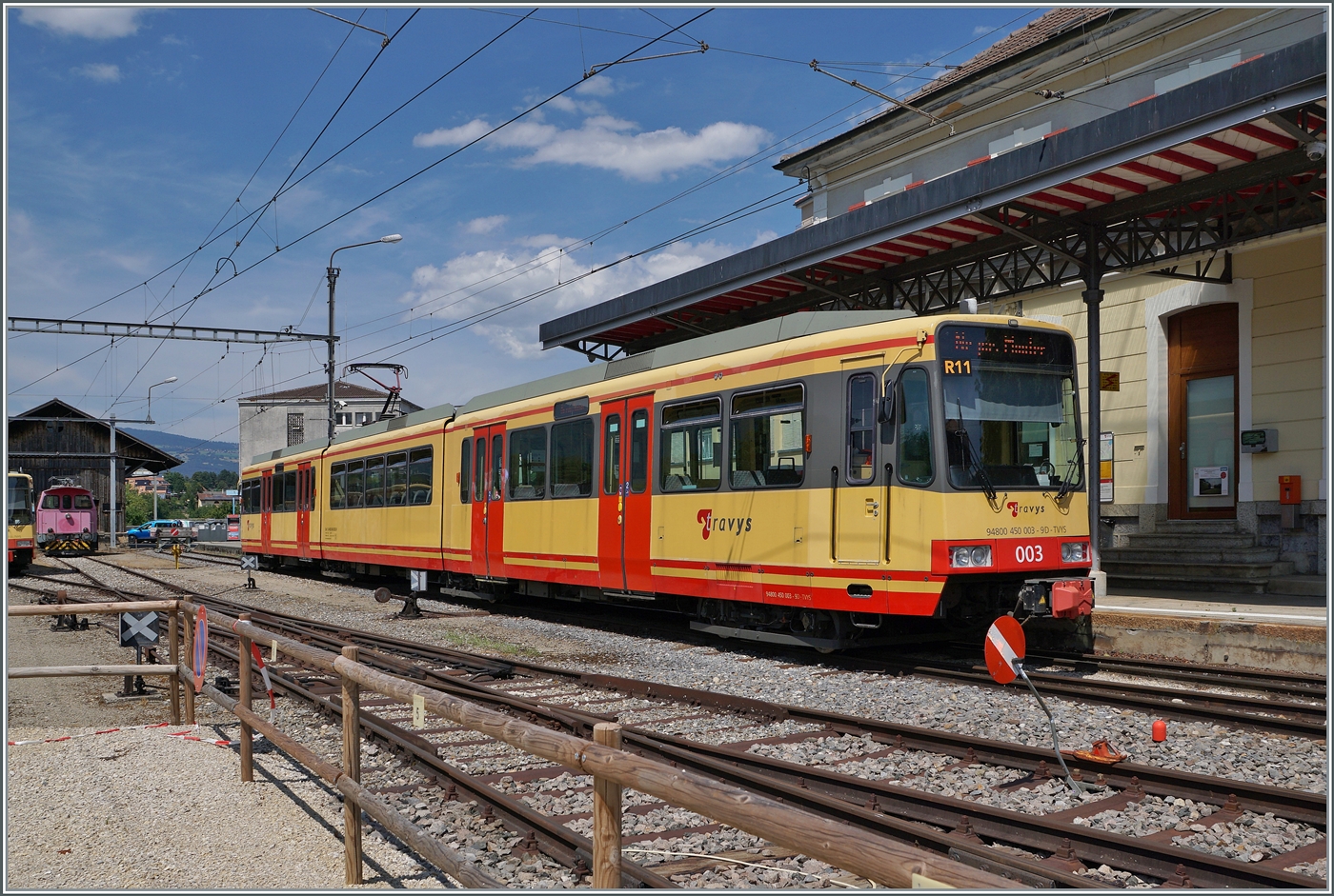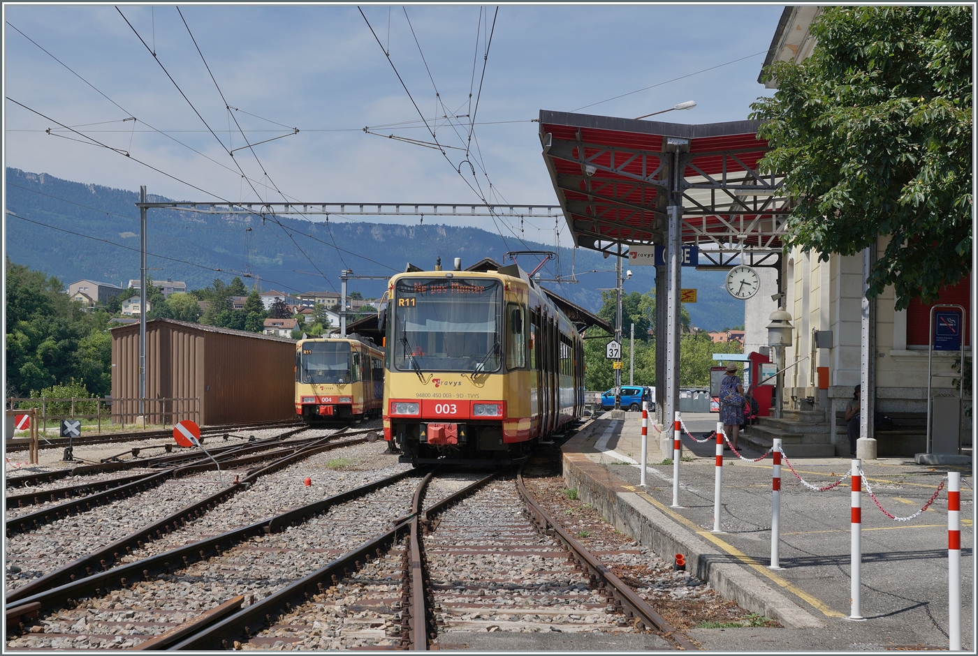 Zwei in Deutschland imatrikulierte Fahrzeuge stehen in Chavonray: Links wartet der TRAVYS/OC Be 4/8 003 auf die Abfahrt nach Orbe und rechts die an die BLS vermietete RailPool 187 008-8 auf ihre Güterlast.