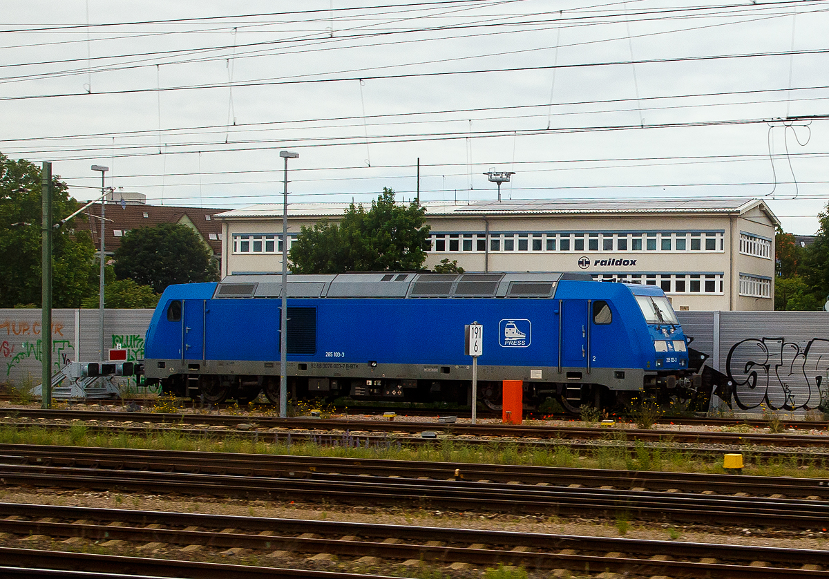 Die an die DB Fernverkehr AG, als ICE-Abschlepplok (mit aufgesetzter Scharfenberghilfskupplung) vermietete 285 103-3 (92 88 0076 003-7 B-BTK), eine Bombardier TRAXX F140 DE der PRESS - Eisenbahn-Bau- and Betriebsgesellschaft Pressnitztalbahn mbH (Jöhstadt), ist am 11.06.2022 in Erfurt abgestellt (Aufnahme aus einem Zug heraus).