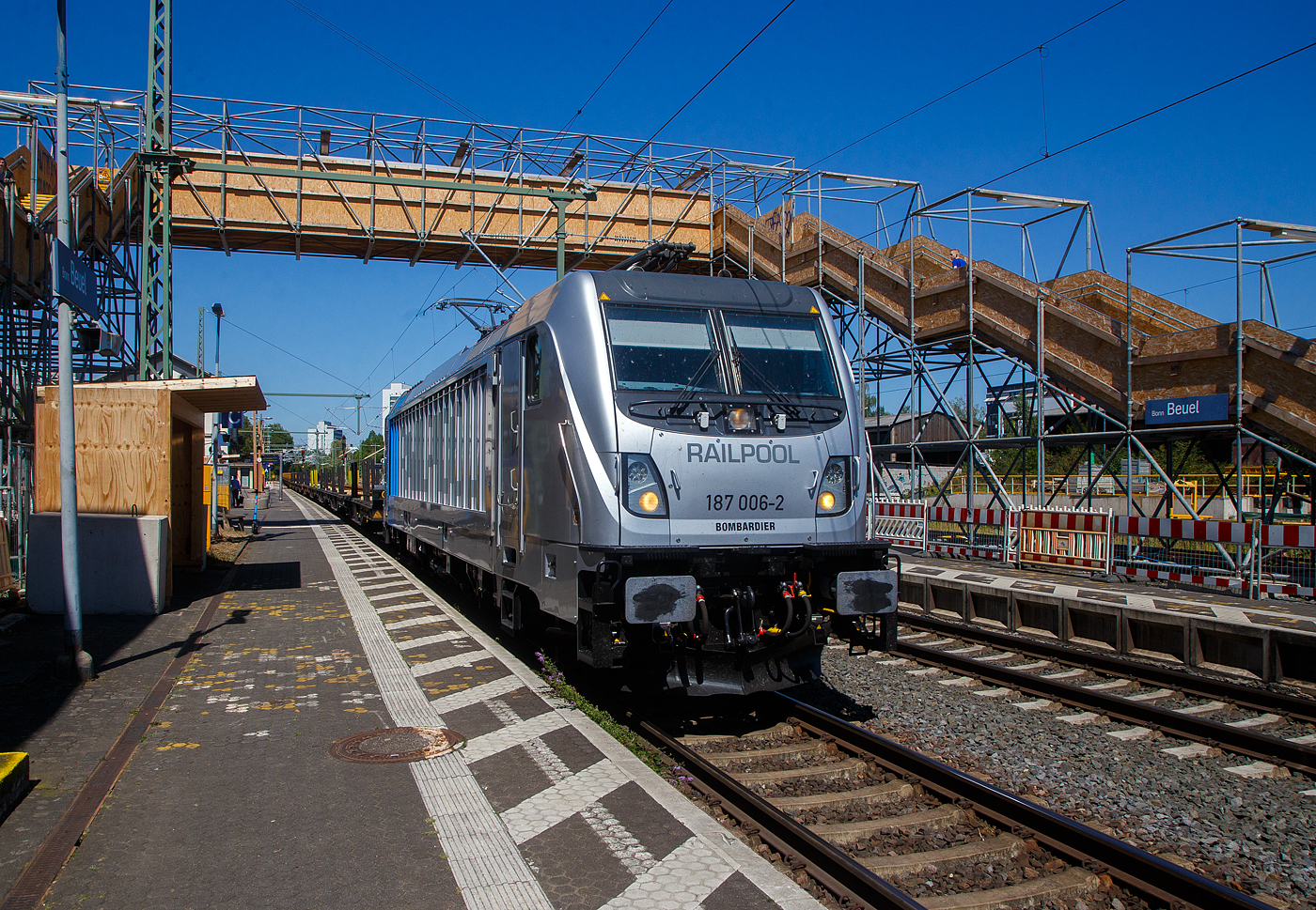 Die Railpool 187 006-2 (91 80 6187 006-2 D-Rpool) fährt am 12 August 2022, mit einem Langschienenzug, durch den Bahnhof Bonn-Beuel in Richtung Süden. Die Lok ist eine Bombardier TRAXX F160 AC3 LM (zugelassen für 160 km/h, daher Variante F160). Sie wurde 2013 von Bombardier in Kassel unter der Fabriknummer 35057 gebaut. Sie hat die Zulassungen Deutschland, Österreich und die Schweiz (D/A/CH).