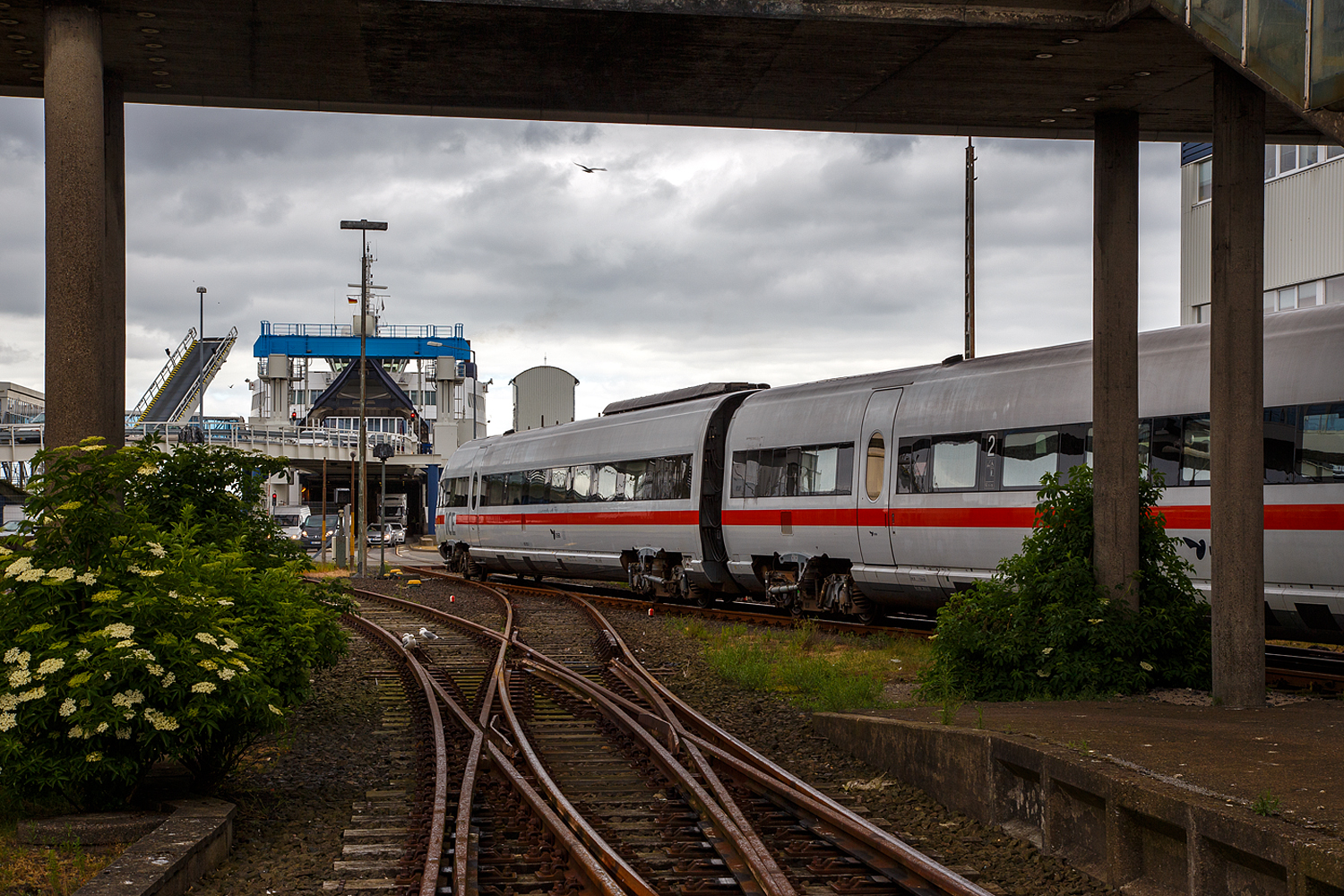 Der ICE TD bzw. VT 605, Tz 5503 hat am 15 Juni 2015, als ICE 33 (Hamburg Hbf - Koebenhavn H), den Fährbahnhof Puttgarten erreicht. Nun wird trajektiert, der ICE Dieseltriebzug fährt in die Scandlines Fähre "Prins Richard".