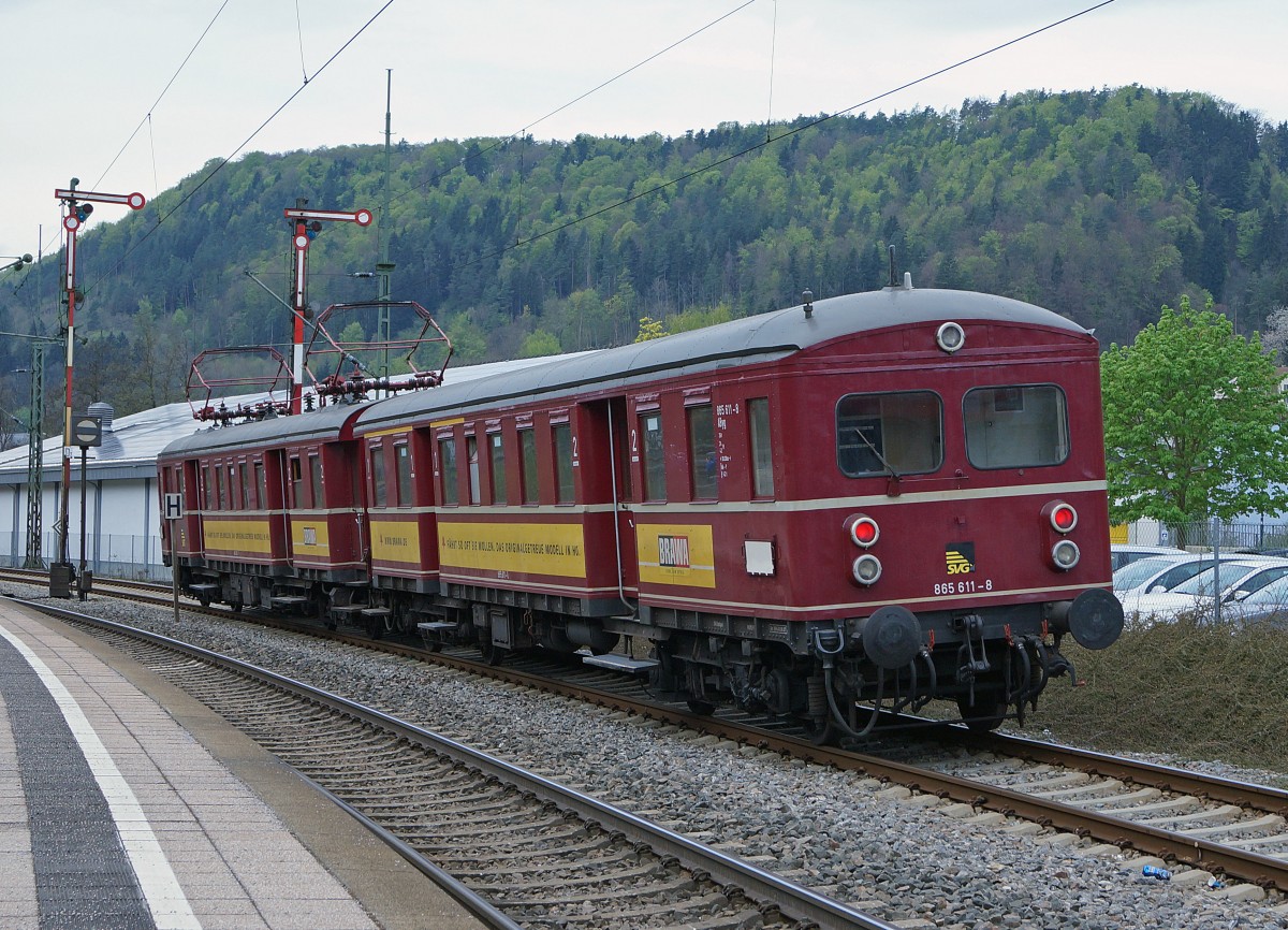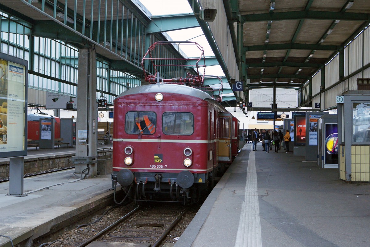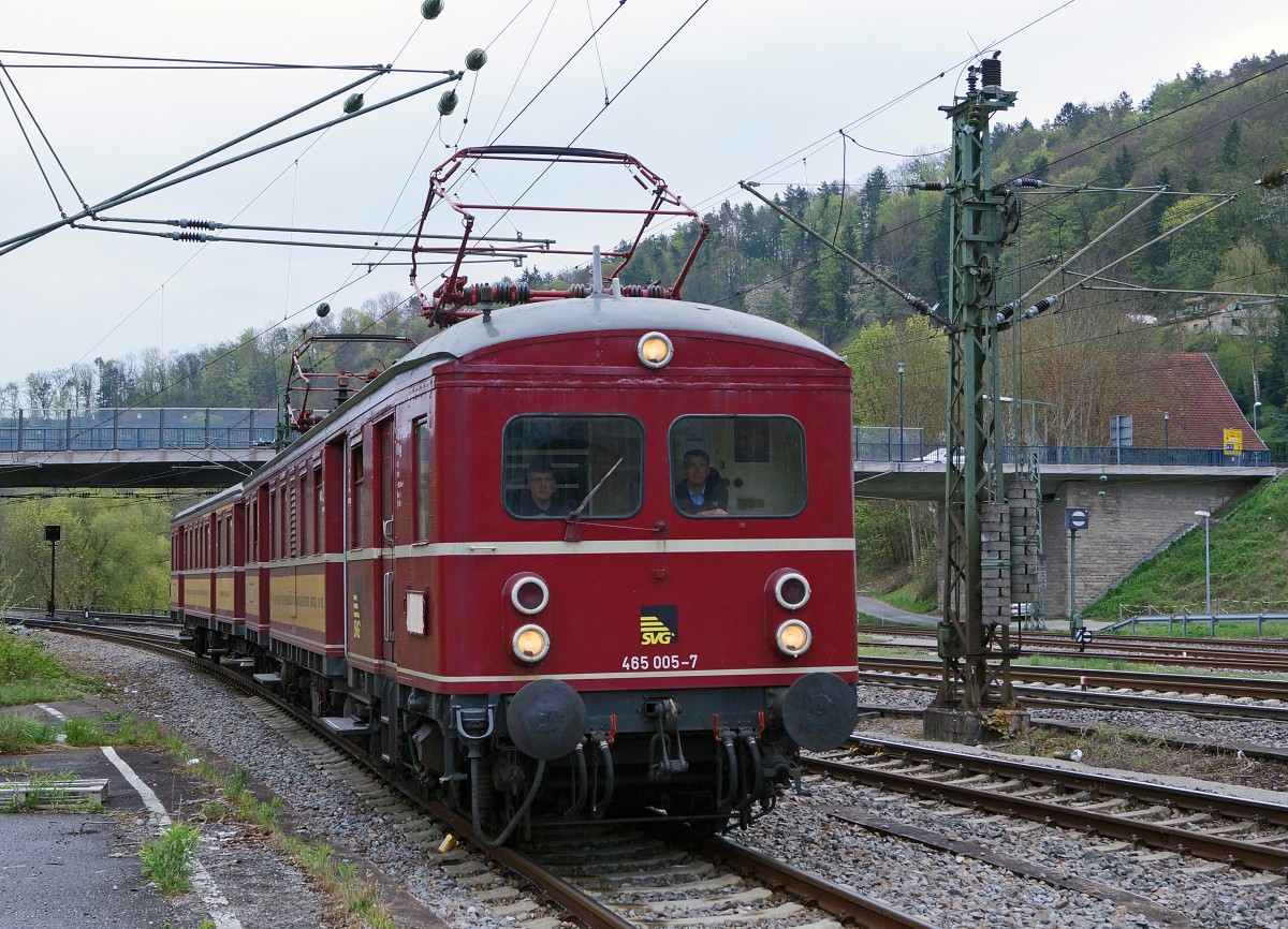 SVG: 1. Abschiedsfahrt mit dem "Roten Heuler" ET 65 zur Eisenbahn-Erlebniswelt Horb am Neckar. Mit der Elektrifizierung der Hauptstrecke Stuttgart-Ulm im Jahre 1933 wurde auch in Würtemberg eine neue Aera im Eisenbahnverkehr beschritten. Für die Elektrifizierung der Vorortstrecken rund um Stuttgart entwickelte die Maschinenfabrik Esslingen (ME) einen neuartigen Trieb und Steuerwagen für die Deutsche Reichsbahngesellschaft (DRG). Zunächst noch als Baureihe elT 12 und elS 22 bezeichnet, später dann als ET/ES 65 Baureihe 465 (865). Ueber 45 Jahre lang, von 1933 bis 1978, haben die "filigranen Schwaben" der Baureihe ET 65 Millionen von Fahrgästen zur Arbeit, zur Schule und zu Freizeitaktivitäten begleitet. Die "Roten Heuler" aus Esslingen haben verkehrsgeschichte geschrieben ! Erst 1978 wurde mit der Baureihe 420 ein Nachfolger ins Rennen geschickt und die ET 65 kamen in den verdienten Ruhestand. Das "Knacken und Zischen" der "Roten Heuler" ist aber bis heute unvergessen. 2006/2007 hat die SVG beide Fahrzeuge wieder in Betrieb genommen. Nach rund 8 Jahren im Sonderzugsverkehr fährt der ET 65 nun erneut in den Ruhestand, da eine weitere Hauptuntersuchung sehr teuer ist. Auf dem hintersten Geleise des Bahnhofs HORB warteten der 465 065-7 und der 865 611-8 am 25. April 2015 auf die abendliche Rückfahrt nach Stuttgart Hbf. Der IC Stuttgart-Zürich mit der 115 350-1 befindet sich bei einem Zwischenhalt auf der Fahrt nach Singen. Foto: Walter Ruetsch