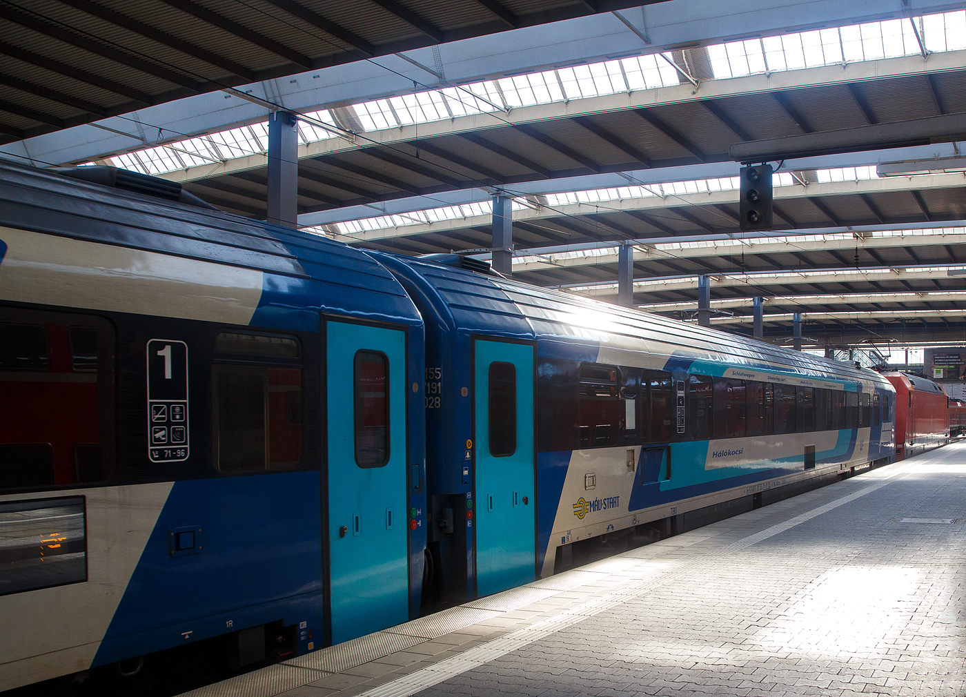 Der 1/2 Klasse Schlafwagen HR-H´PP 61 78 71-70 010-1 der Gattung WLee der H´PP - Hrvatske ¸eljeznice Putnički prijevoz/ Kroatische Eisenbahnen Personenverkehrssparte am 25 Juli 2022 im Hbf München eingereiht im Zugverband als Wagen 271 des EN 498 „Lisinski“ (Zargreb – Dobova – Ljubjana – Jesenice – Villach – Salzburg – München) / EN 462 „Kálmán Imre“ (Budapest - Győr - Hegyeshalom - Wien Hbf - Linz – Salzburg - München).