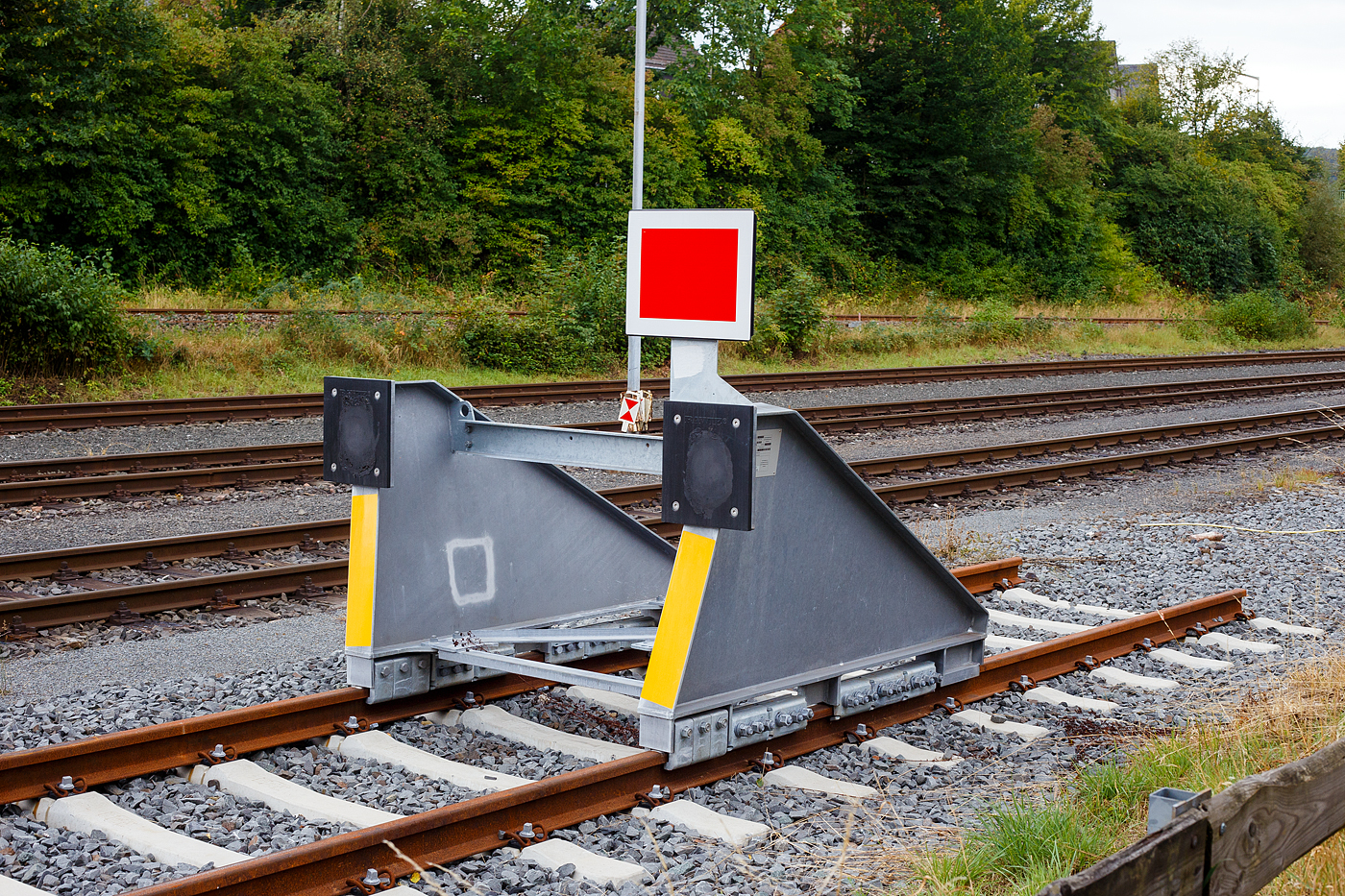 RAWIE feuerverzinkter Bremsprellbock Typ 10 EB Ausf. 10 EB SP auf dem KSW Rangierbahnhof Herdorf (Freien Grunder Eisenbahn KSW NE447 / DB-Nr. 9275), hier am 10 September 2024.