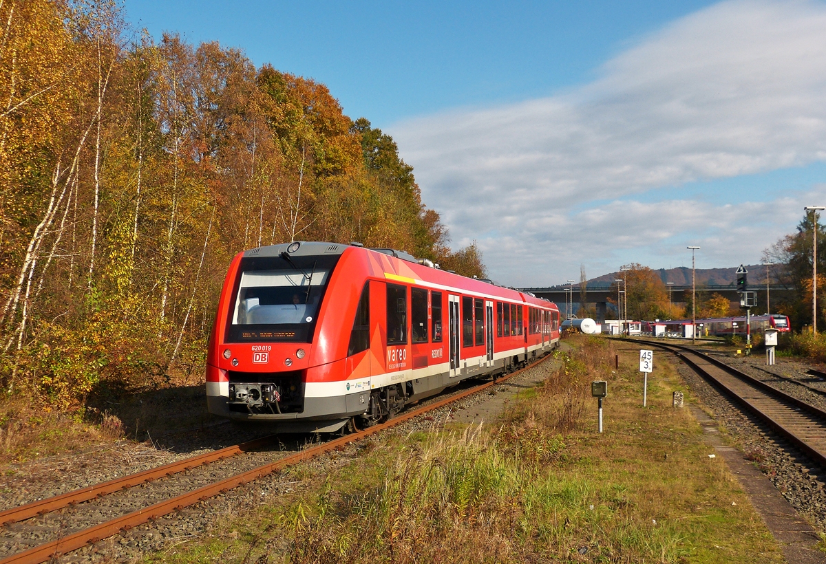 Der dreiteilige Dieseltriebzug ALSTOM Coradia LINT 81 - 620 508 / 621 008 / 620 008 der DB Regio (VAREO) fährt am 02.11.2014 als RB 25 "Oberbergische Bahn" (Meinerzhagen - Köln Hansaring)nach durch Ründeroth.