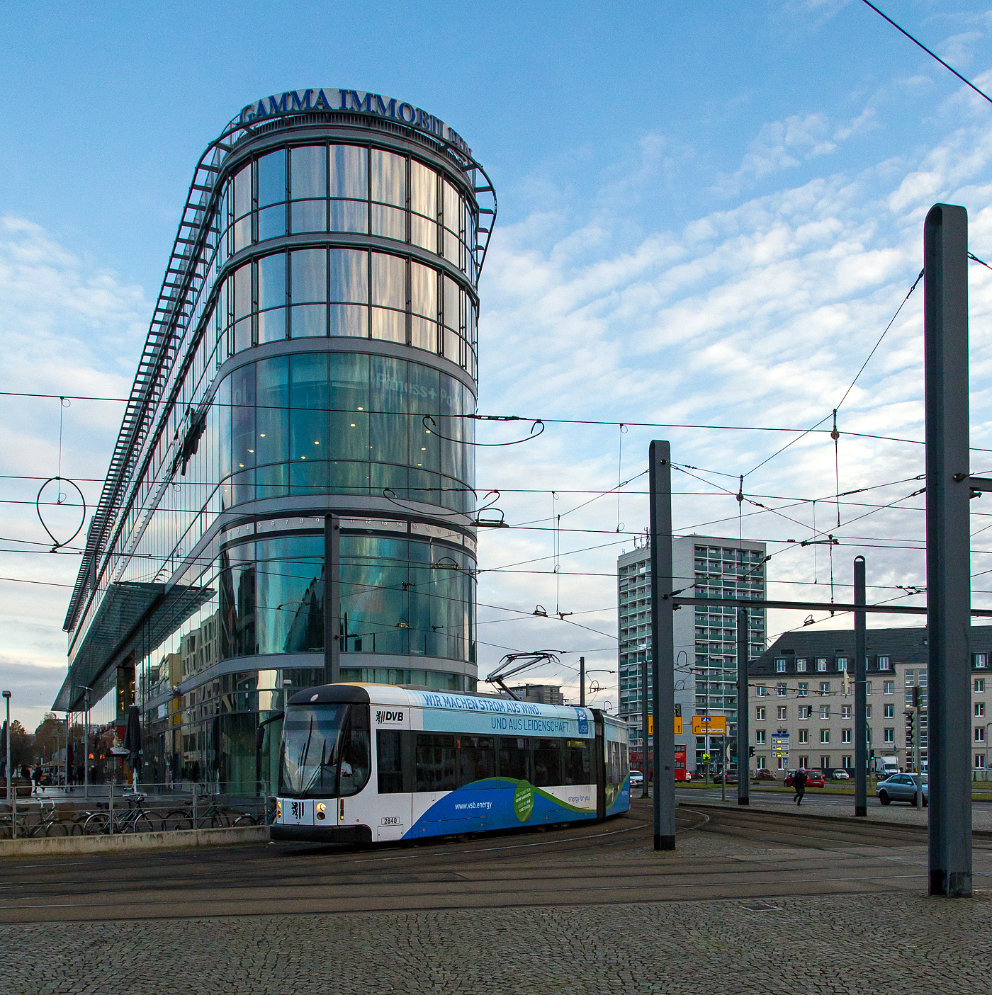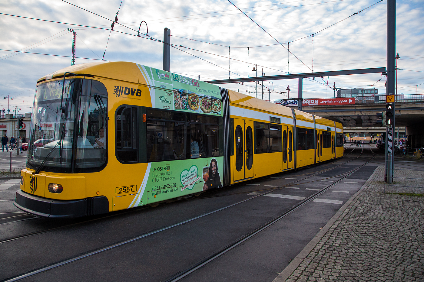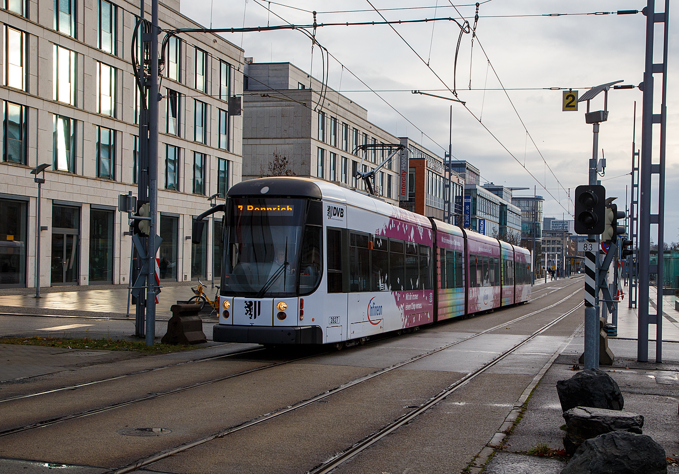 Der Niederflurgelenktriebwagen 2527 der Dresdner Verkehrsbetriebe AG (DVB) fährt am 06.12.2022 von der Station Altmarkt (beim Dresdner Striezelmarkt) als Linie 4 weiter in Richtung Radebeul West.