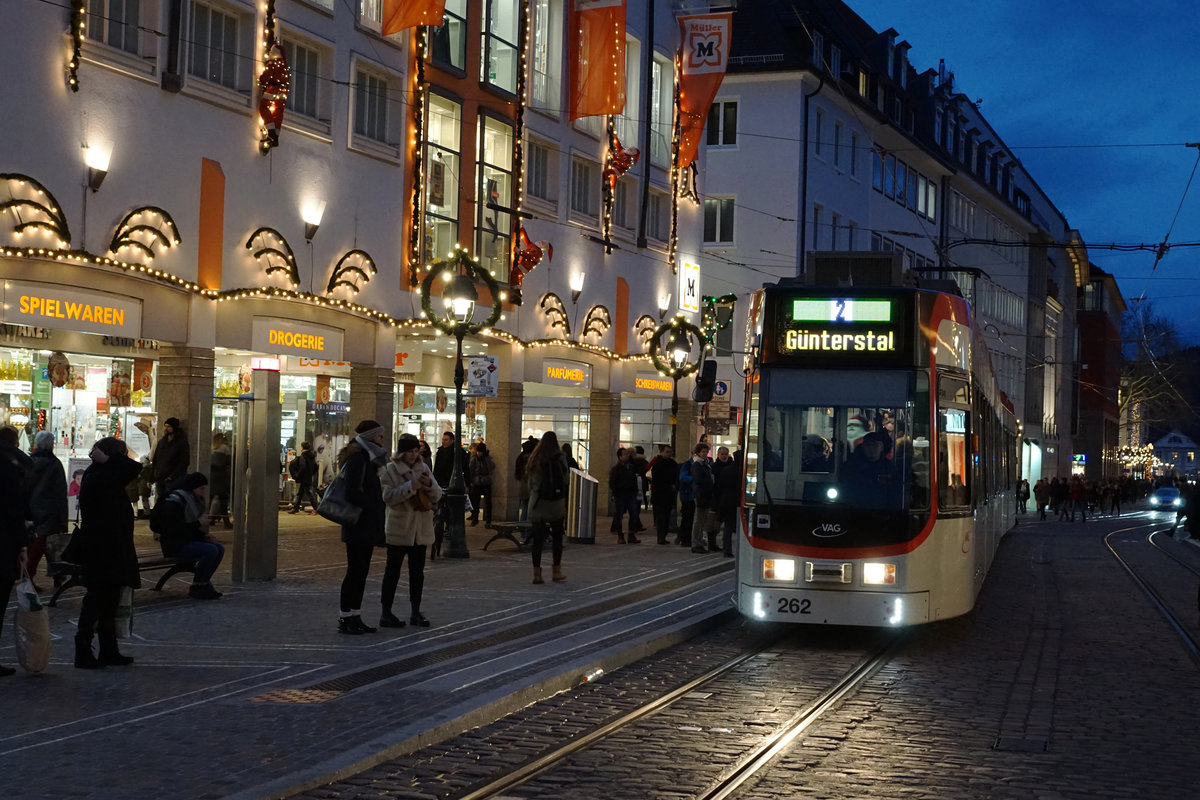Die Freiburger Strassenbahn CAF Urbos 100 N° 304 bei der Haltestelle beim Bahnhof auf dem Weg nach Haid.