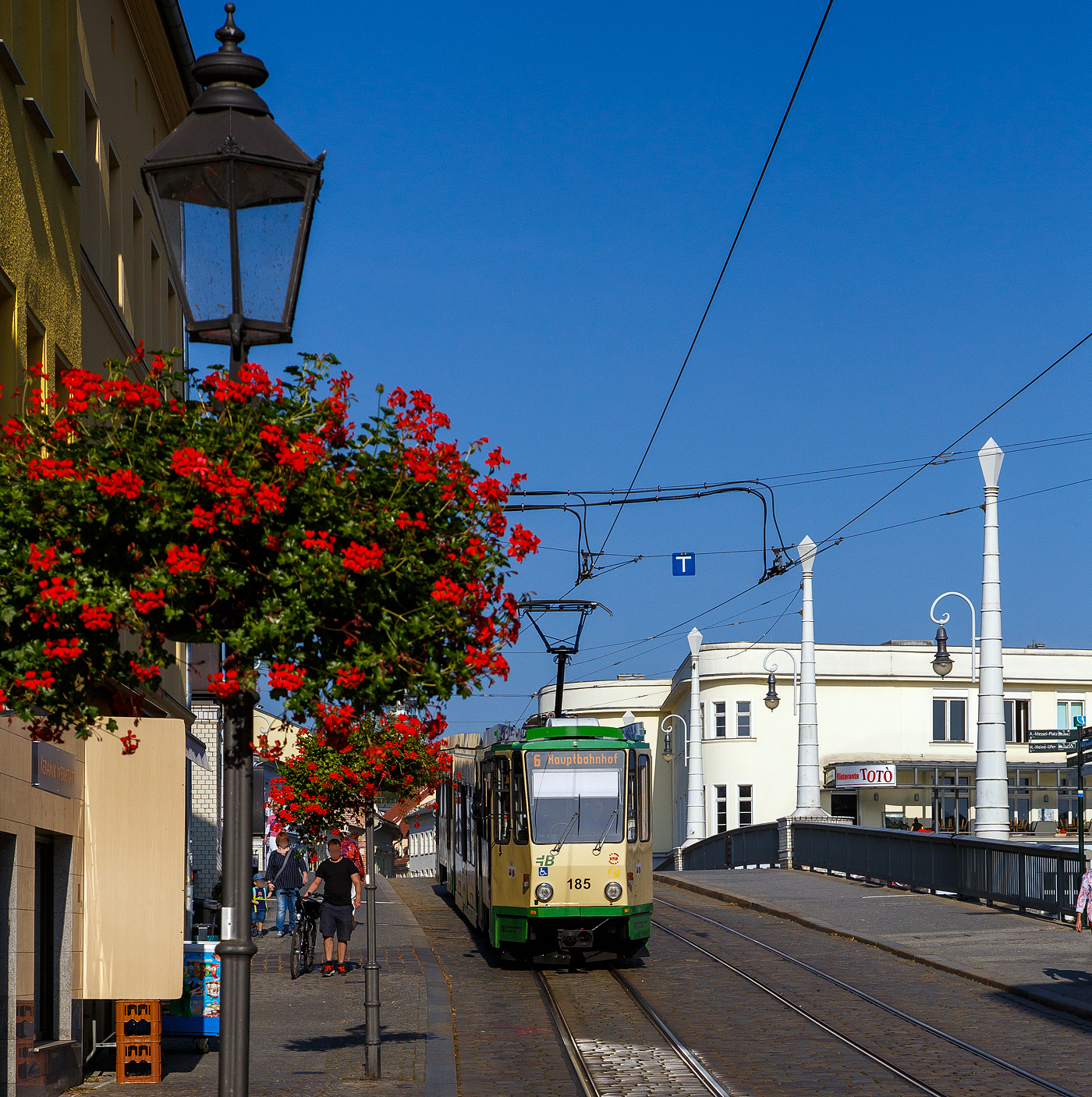 Der Triebwagen VBBr 174 der Verkehrsbetriebe Brandenburg an der Havel GmbH, ein modernisierter vierachsiger Einrichtungs-Kurzgelenktriebwagen vom Typ Tatra KT4D-MC (ex Tatra KT4DM), auf Sonderfahrt (verm. Dienstfahrt), fährt am 19.09.2018 auf der Jahrtausendbrücke in Richtung Depot (Upstallstraße).