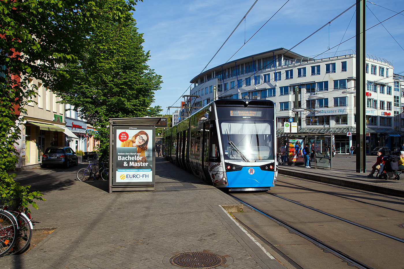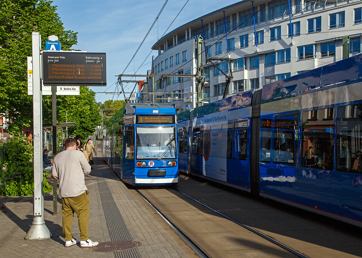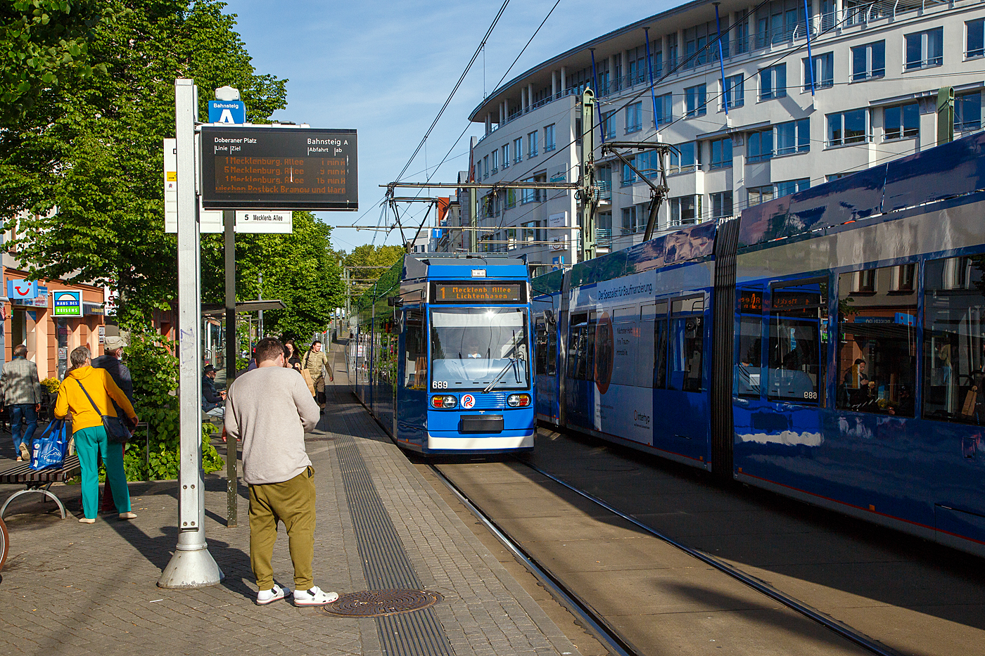 Straßenbahn Getümmel in Rostock, im Bild gleich vier Triebwagen im Bild am Doberaner Platz, hier am 14.05.2022. Im Vordergrund der Triebwagen 657 ein Niederflur-Gelenktriebwagen vom Typ DUEWAG 6N GTW DE „6N1“.