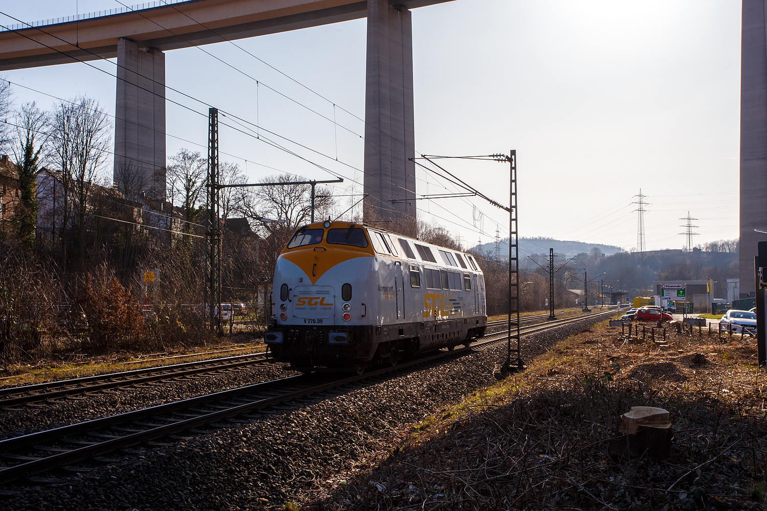 Die dieselelektrische Vossloh DE 12 / 4125 006-1 (92 80 4125 006-1 D-ISL) / Lok 11 der InfraServ Logistics GmbH (Frankfurt/M-Höchst) fährt am 29 Oktober 2025 mit einem Kesselwagenzug durch Kirchen (Sieg) in Richtung Siegen, vermutlich mit dem Ziel Frankfurt am Main-Höchst. Die Wagen waren laut Gefahrguttafelen (265/1017) mit Chor beladen.