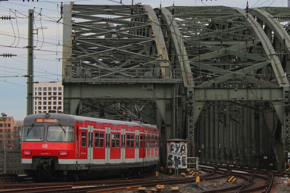 Mit etwas Zooming mit der Kamera kann Mann vom Bahnsteig in Köln Hbf Tirebzüge nach/von die Hohenzollernbrücke fotografieren, wie am 15 Februar 2024 DB 420 979 unter Beweis stellt.