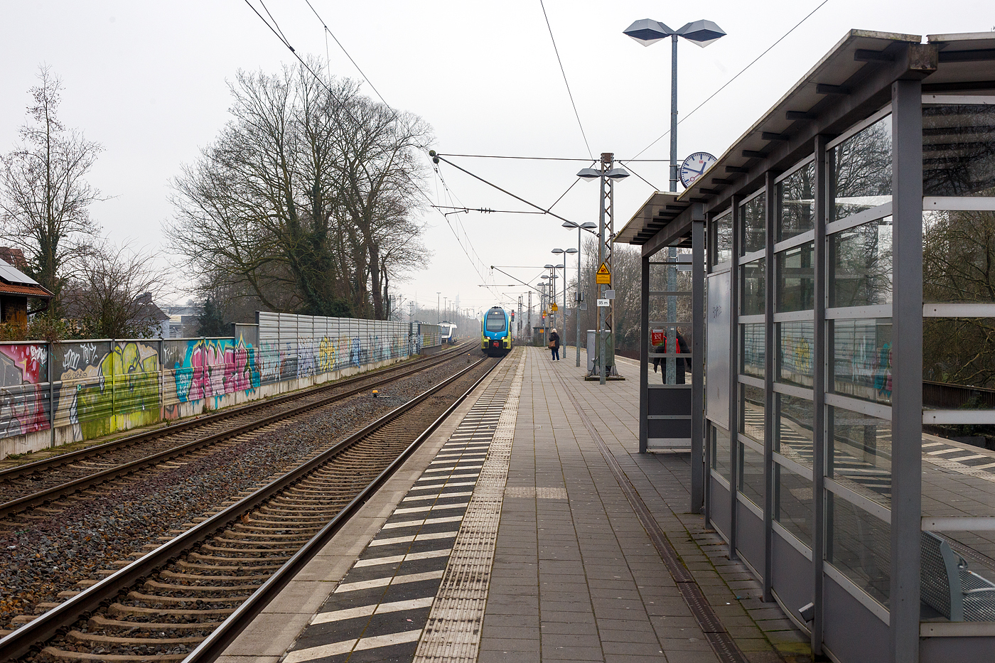 Der sechsteilige Doppelstocktriebwagen Stadler KISS (160) - ET 610 (94 80 0445 010-2 D-WFB ff.) der WestfalenBahn erreicht am kalten 21 Januar 2025, als RE 60 „Ems-Leine-Express“ (Braunschweig – Peine – Lehrte – Hannover – Minden – Löhne – Osnabrück – Rheine), den Bahnhof Osnabrück Altstadt.