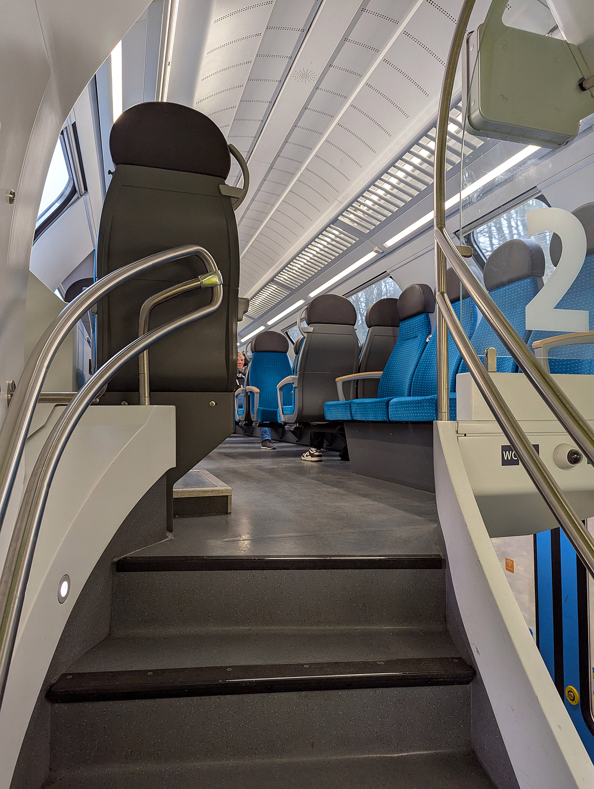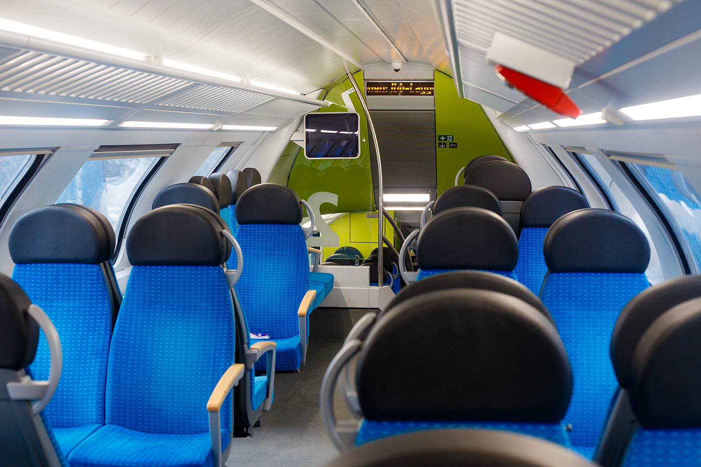 Innenraum/Interieur des fünfteiligen Talent 2 – 94 80 9442 358-9 D-NXG betrieben vom National Express Rail GmbH (Eigentümer des Triebzuges ist aber der ZV VRR Eigenbetrieb Fahrzeuge und Infrastruktur), hier am 26 Mai 2024 in Haan-Gruiten.