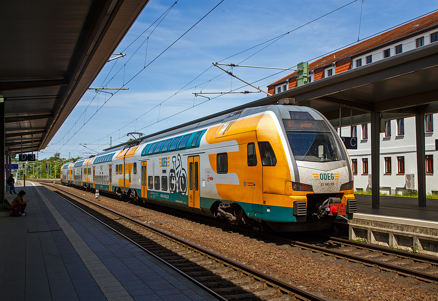 Der vierteilige Stadler KISS - ET 445.101 (94 80 0445 101-9 D-ODEG / 94 80 0446 101-8 D-ODEG / 94 80 0446 601-7 D-ODEG / 94 80 0445 601-8 D-ODEG) der Ostdeutschen Eisenbahn (ODEG) steht am 16 Mai 2022 im Hauptbahnhof Schwerin, als RE 2 von Berlin Ostbahnhof nach Wismar, zur Abfahrt bereit. Der KISS wurde 2012 von Stadler Pankow GmbH in Berlin unter der Fabriknummern 39029 bis 39033 für die BeNEX GmbH/ Prignitzer Eisenbahn zu Netinera, denen gemeinsam die ODEG gehört, gebaut. Von der Ostdeutschen Eisenbahn (ODEG) wurden im Januar 2010 insgesamt 16 vierteilige Stadler DoSto bestellt, die von der Stadler Pankow GmbH gefertigt wurden und zum Fahrplanwechsel im Dezember 2012 im Berlin-Brandenburger Regionalverkehr zum Einsatz kommen sollten. Die vier Wagen eines Triebzuges sind unterschiedlich aufgebaut: • 445 1xx (A-Wagen): Sitzplätze 2. Klasse, Mehrzweckbereich (unten), WC, Hauptschalter, Antriebsmodul mit Transformator, Stromrichter und Triebdrehgestell am Übergangsende zum Wagen C. • 446 1xx (C-Wagen): Sitzplätze 2. Klasse, Mehrzweckbereich (unten), behindertengerechtes WC, Stromabnehmer • 446 6xx (D-Wagen): Sitzplätze 2. Klasse, Mehrzweckbereich (unten), kein WC, Stromabnehmer • 445 6xx (B-Wagen): Sitzplätze 1. Klasse (oben) und 2. Klasse, Mehrzweckbereich (unten), WC, Hauptschalter, Antriebsmodul mit Transformator, Stromrichter und Triebdrehgestell am Übergangsende zum Wagen D. Der erste Zug wurde im Februar 2012 fertiggestellt und war u. a. auf dem Eisenbahnversuchsring Velim zu Testfahrten unterwegs. Im Herbst 2012 wurde jedoch bekannt, dass nicht alle Züge bis zur Betriebsaufnahme zum Fahrplanwechsel am 9. Dezember 2012 fertiggestellt werden konnten. Tatsächlich startete die ODEG am 9. Dezember 2012 mit geliehenen Fahrzeugen anderer Hersteller, weil zu diesem Zeitpunkt noch keine Zulassung vorlag. Die ersten vier der 16 bestellten Züge erhielten am 21. Dezember 2012 die Zulassung vom Eisenbahn-Bundesamt und wurden ab dem 8. Januar 2013 nach und nach im Fahrgastbetrieb auf der Linie RE 4 eingesetzt und lösten ab dem 10. März 2013 allmählich die Ersatzzüge der DB Regio auf der Linie RE 2 ab. Am 21. Juni 2013 erhielt der 15. und damit vorletzte KISS 0445 108 seine Zulassung. Der 16. und letzte KISS (0445 115) wurde am 16. Juli ausgeliefert und am 17. August zum „Tag der offenen Tore“ auf den Namen Eberswalde getauft. Seit März 2020 verkehrt der erste Triebzug mit einem inneren Redesign. Die neuen Böden bestehen zu 80 Prozent aus recyclingfähigem Material, die erste Klasse wurde in den Servicewagen verlegt, die Sitze in der zweiten Klasse erhielten lederbezogene Kopfstützen, FIS-Anlagen wurden ausgetauscht und der Einbau von WLAN-Routern wurde vorbereitet. Im KISS wird modernste Zugtechnologie erlebbar. Die komfortablen, innovativen, spurtstarken S-Bahn-Züge der neuen Generation sind technologisch top ausgestattet. Sicherheit, Komfort, Ökonomie und Leistung treffen auf doppelstöckiges Design. Technische Merkmale / Charakteristika: • Wagenkasten bestehen aus vollständig geschweißter aluminium-integral-Bauweise. • Heller, klimatisierter Fahrgastraum mit individueller Gestaltung • Mehrzweckräume für Fahrräder, Kinderwagen und Gepäck • Großzügige, barrierefrei erreichbare Flächen • LED Beleuchtung des Fahrgastraumes • 24 Sitzplätze mit Tischen in der 1. Klasse • Klimaanlage, Fußbodenheizung • Großzügig gestaltete Einstiegsbereiche fördern optimalen Fahrgastfluss • Für 550er-Bahnsteige optimierte Einstiegshöhe • 3 geschlossene WC-Systeme (davon1 barrierefrei, inkl. Babywickeltisch) • Ergonomisch gestalteter Führerstand • Luftgefederte Trieb- und Laufdrehgestelle • 8 Einstiegstüren pro Seite • Mehrfachtraktionsfähig • Spaltüberbrückung an allen Türen TECHNISCHE DATEN: Typ: 4-teilige KISS (Baureihe 445) Hersteller: Stadler Pankow GmbH Anzahl bei ODEG:16 Fahrzeuge Spurweite: 1.435 mm (Normalspur) Achsanordnung 2‘Bo‘ + 2‘2‘ + 2‘2‘ + Bo‘2‘ Länge über Kupplung 105.220 mm Drehzapfenabstände: 18.550 Achsabstand im Drehgestell: 2.500 mm Triebraddurchmesser: 920 mm (neu) Fahrzeugbreite 2.800 mm Fahrzeughöhe 4.630 mm Fußbodenhöhe (über SO): Unterdeck 440 mm / Oberdeck 2.515 mm Einstiegsbreite (lichte Weite): 1.300 mm Einstiegshöhe: 580 mm Leergewicht: 206,4 t Dauerleistung am Rad: 2.000 kW Max. Leistung am Rad: 3.000 kW Anfahrzugkraft: 200 kN Höchstgeschwindigkeit: 160 km/h Max. Beschleunigung: 0,63 m/s² bis 80 km/h Speisespannung 15 kV; 16 ⅔ Hz Sitzplätze: 428 (1. Klasse 24 / 2. Klasse 404, davon 80 Klappsitze) Stehplätze: 661 Fahrradstellplätze: 30 Bremse: KB C-pn-el-R-A-E-Mg (D) Bemerkung: Geräuscharmer Antrieb, Energierückspeisung im Bremsbetrieb Quellen: Stadler Rail, ODEG, Wikipedia